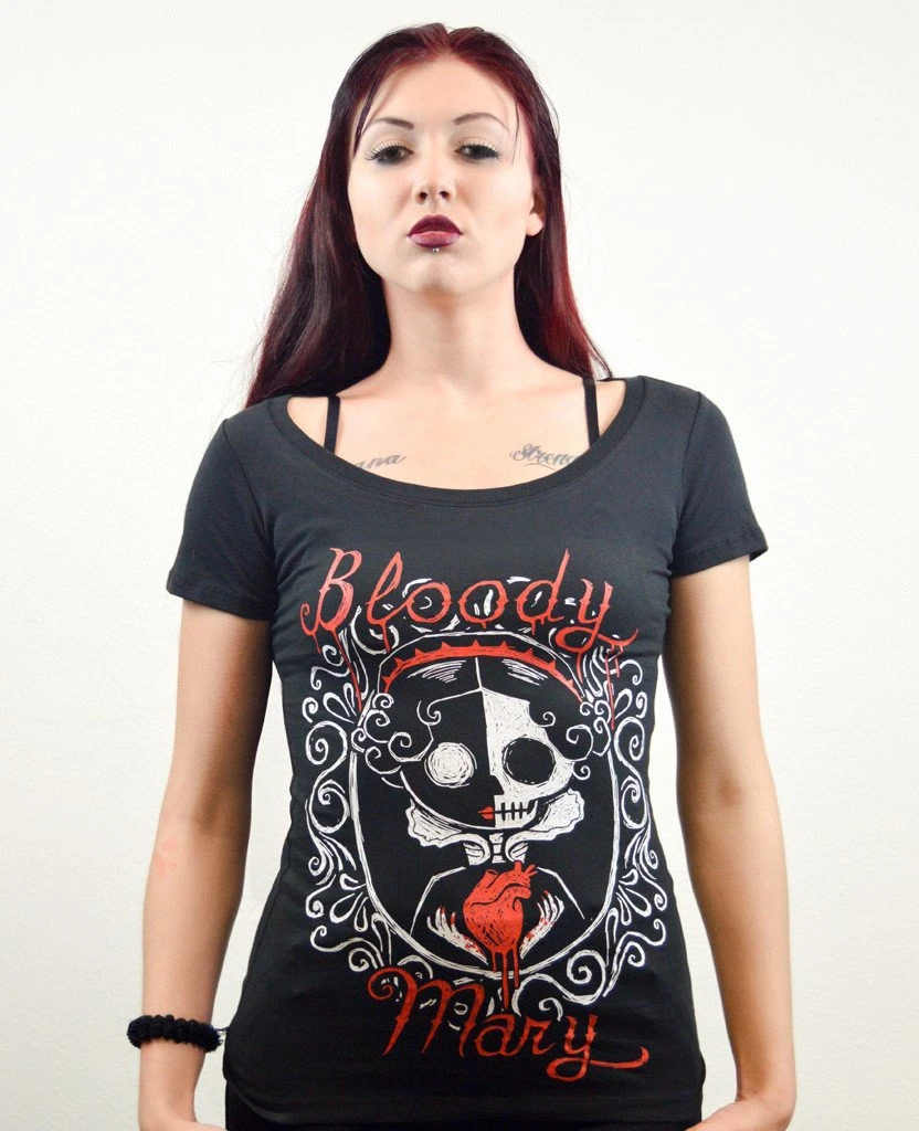 This short sleeve Akumu Ink scoop neck features hand-drawn artwork of the folkloric ghost tale of Bloody Mary. If you say her name three times in front of a mirror she will appear behind you.