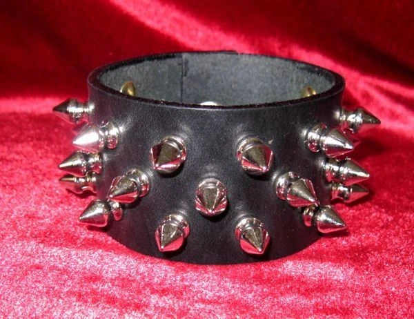 High quality leather wristband with 3 rows of staggered 5/8″ spikes. 1.75″ wide.