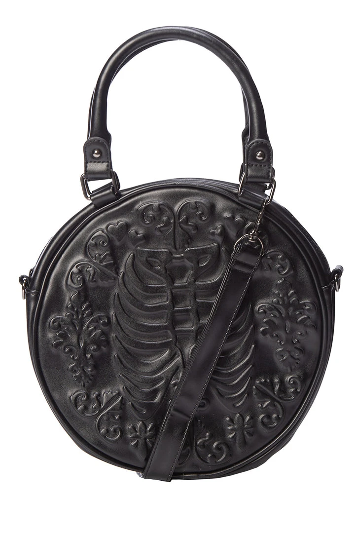 Named after one of our favourite characters from Buffy the Vampire Slayer! The Banned round shoulder bag is embossed with rococo floral detail and a pair of ribs. Top zip fastening. 100% vegan.