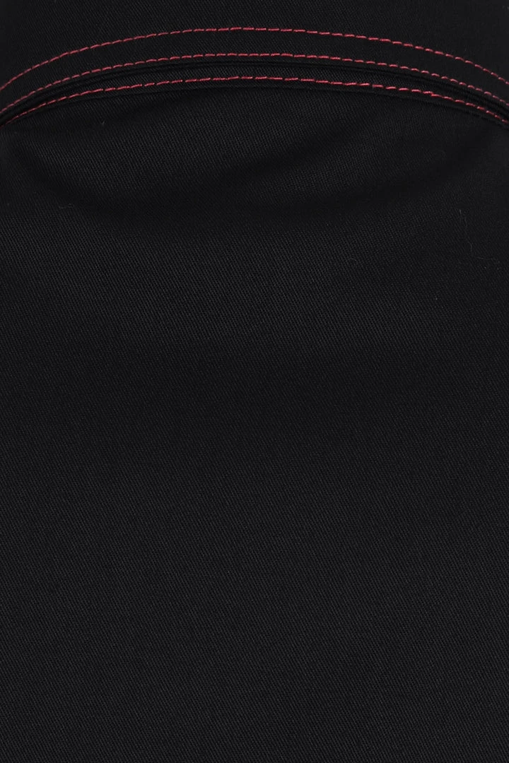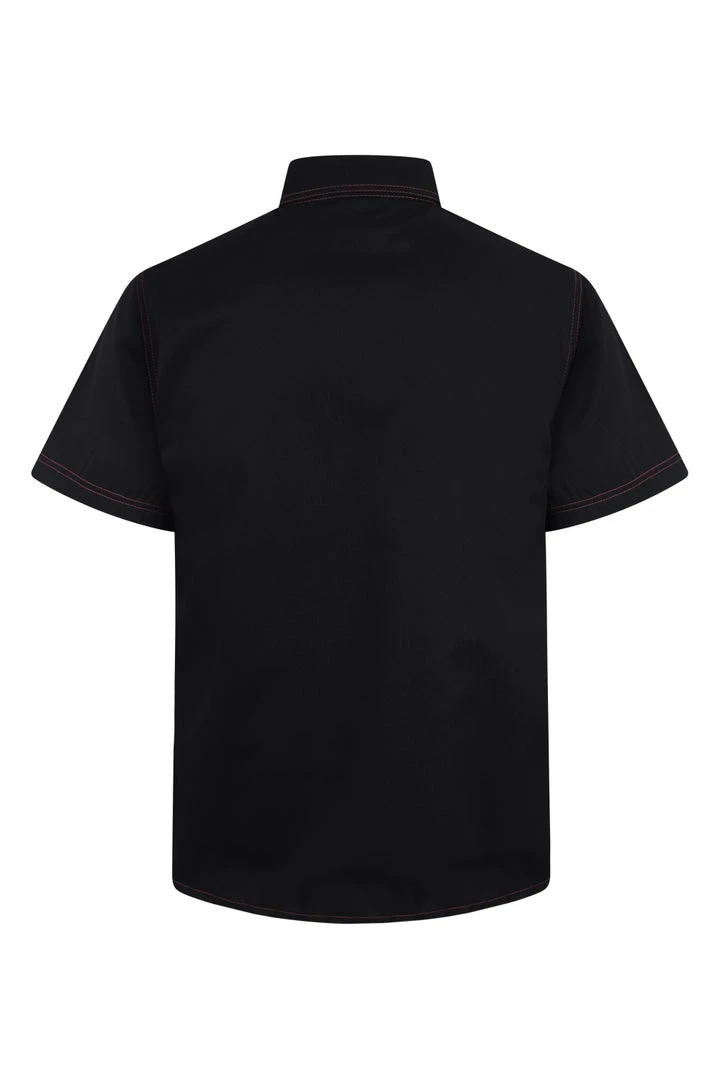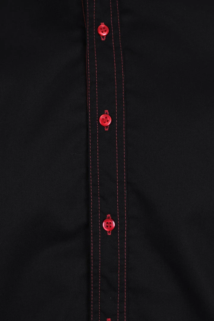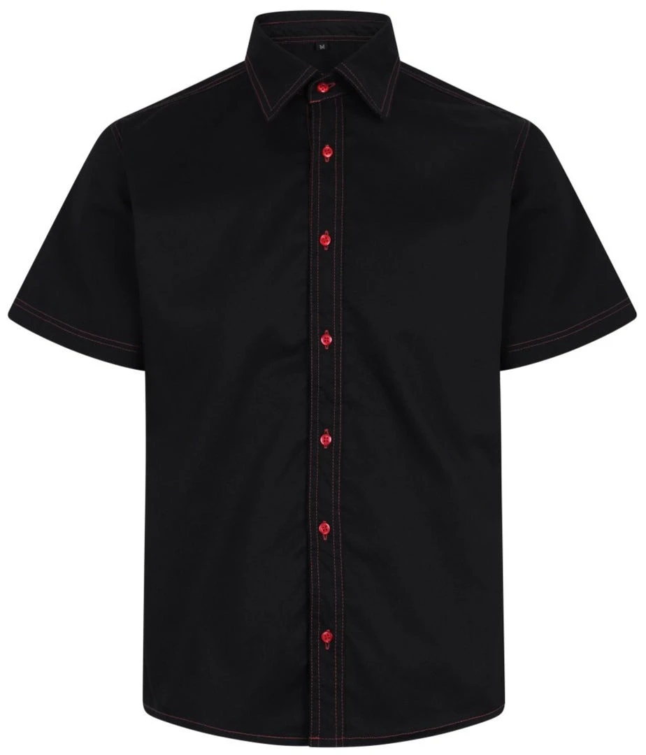The dark shirt has a high neckline, short sleeves and it fastens with red contrast buttons and stitching at the front.