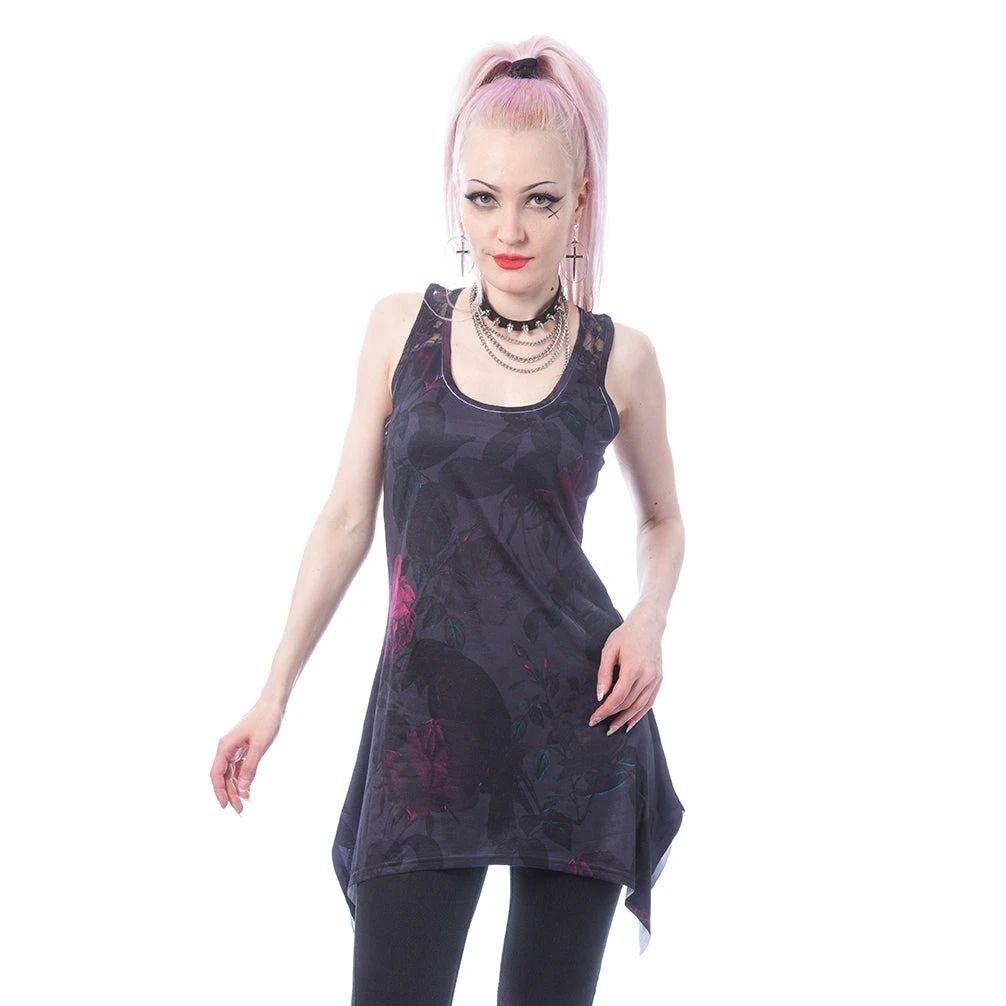 Dark gray long black women’s fit tank/shirt dress with black crows and red roses and filigree lace panel at the upper back.