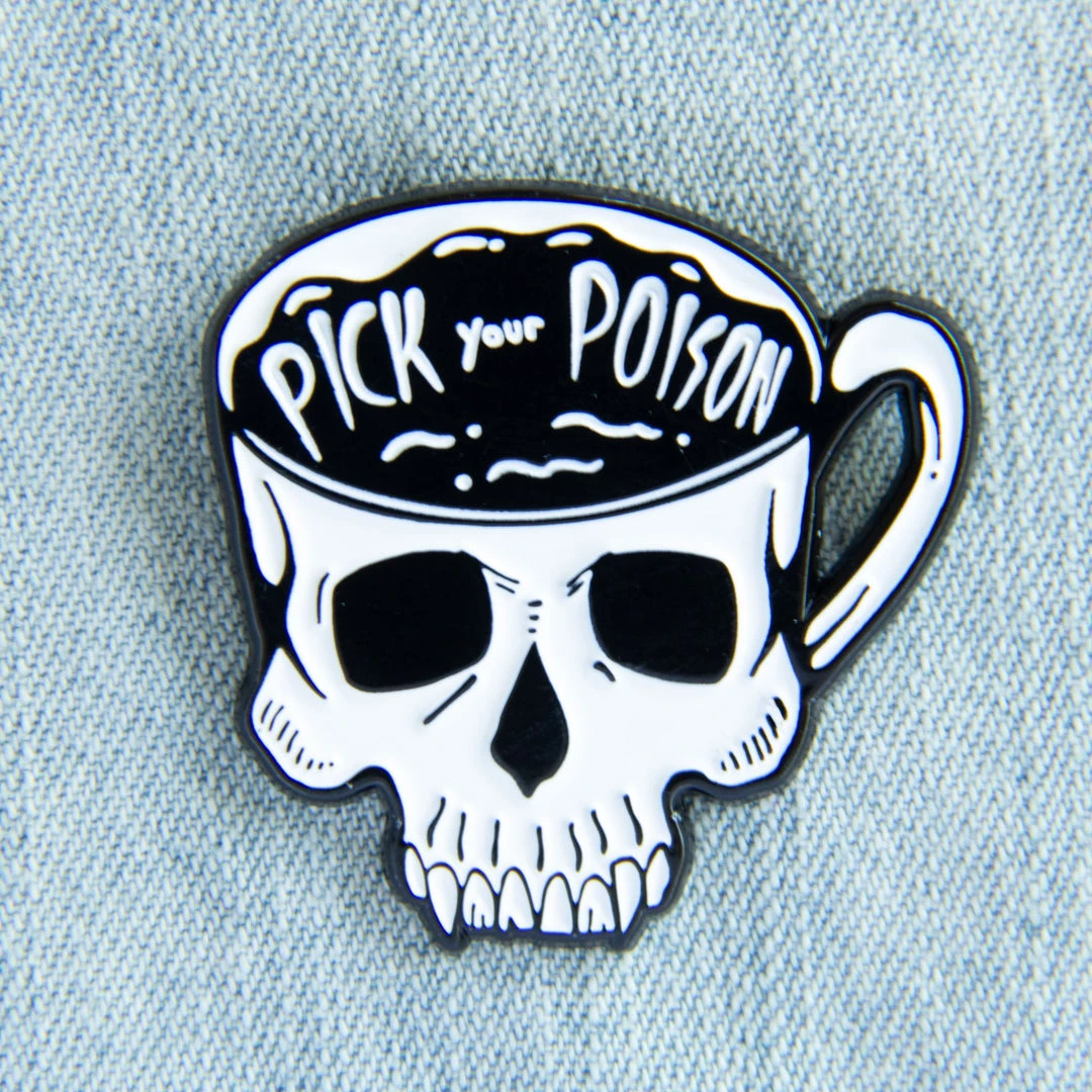 This spooky enamel pin features a coffee cup shaped like a skull with the quote, “Pick Your Poison”. It makes a great gift for caffeine addicts and tea drinkers alike! Wear on your jacket lapel, hat, or backpack for goth flair.