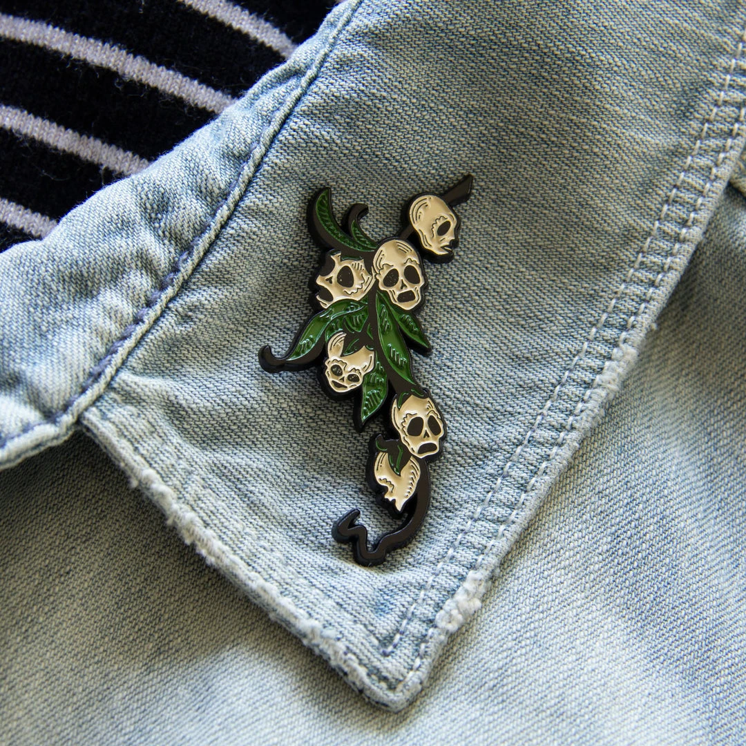 This witchy enamel pin features the dead blooms of the snapdragon flower, which resemble skulls. This macabre plant was thought to have supernatural powers and provide protection from witchcraft.