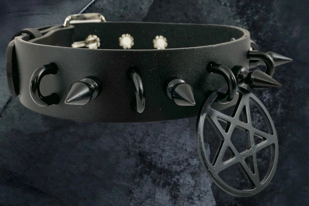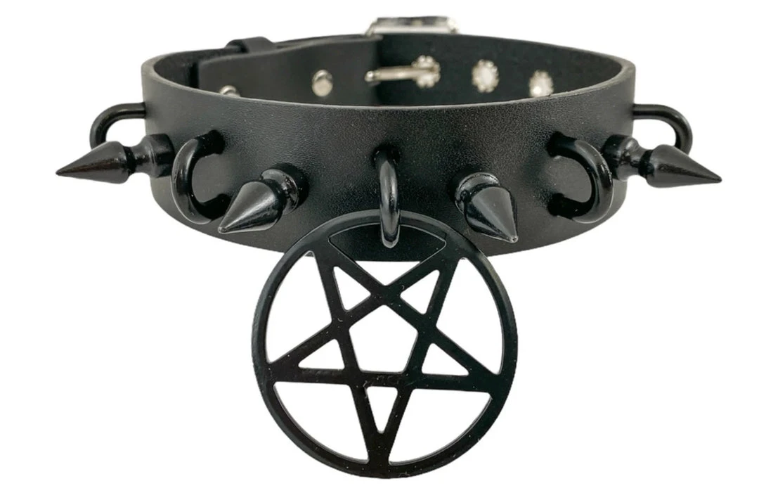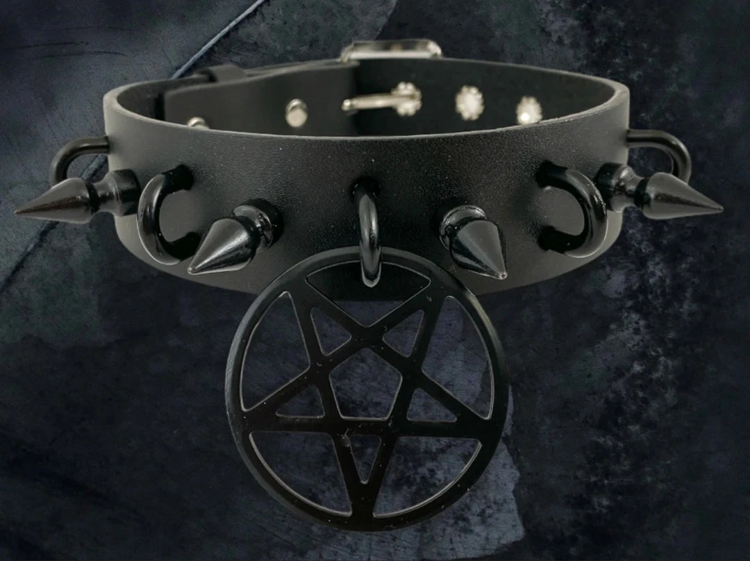 1 1/4″ GENUINE-LEATHER CHOKER WITH U RING AND 2″ STAINLESS STEEL PENTAGRAM RING AND 1″ SPIKE