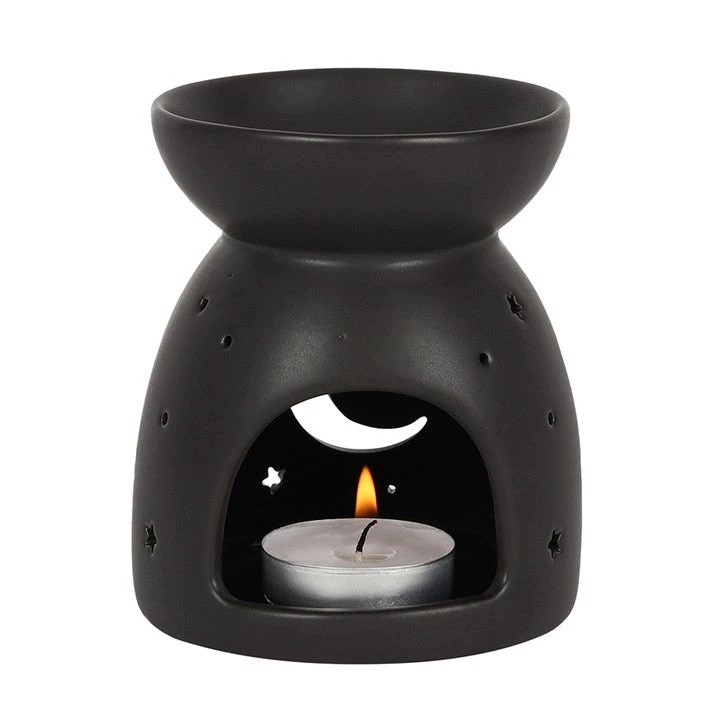 This black ceramic oil burner features a cutout crescent moon and star design with a cool, matte finish. Compatible with both fragrance oil and wax and perfect for Halloween or spooky decor!