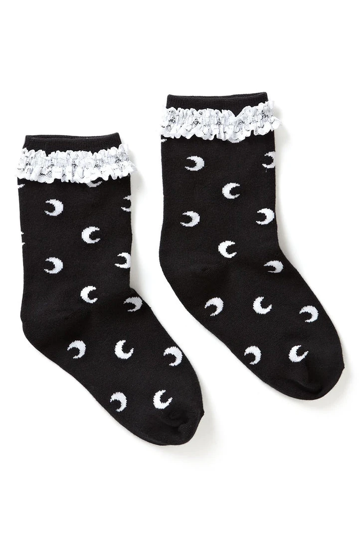 Crescent moon socks with lace detailing – just the right mix of ‘ohhh so Lolita’ goth mixed with some 90s sweetheart vibez. *Boom boom boom* Make yer friends hearts skip a beat when they see ya in these!