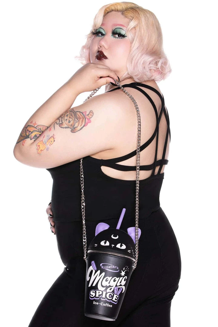 Show the world your magic – the ‘Magic Spice’ handbag mimics the shape of yer fav cold brew, printed motif to front and long chain strap. With zip closure – fits all yer essentials, perfect for nights out, shoots or just hanging with yer coven!