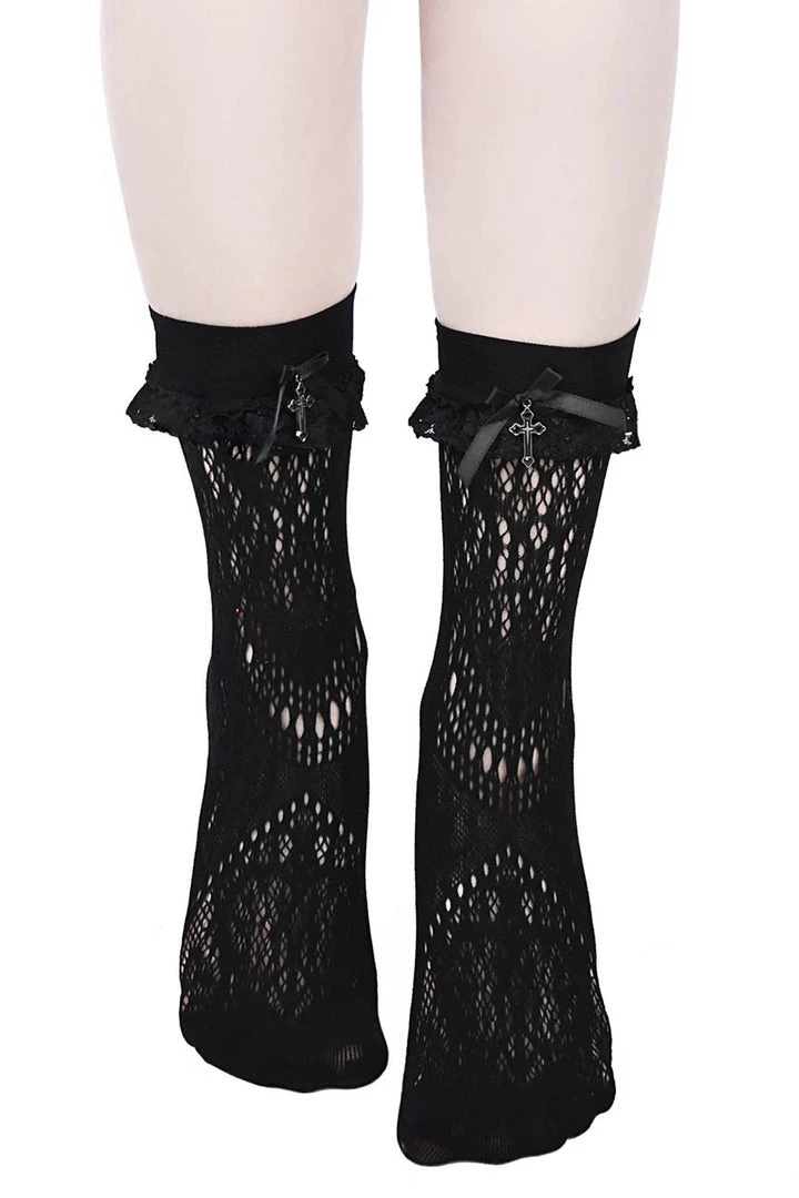 Wanna make yer footwear stand out even more? Or simply add a dash of romance to each and every step? The ‘Amora’ ankle socks are sure to please, silky smooth nylon-blend with just the right amount of detail, finished with a cute bow to the back with a statement cross charm. Dreamy!