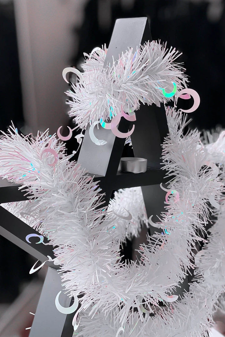 Get into the festive spirit with our new ‘Luna’ hexmas tinsel, large size with crescent moon decorations and all-white finish. Perfect for adding your special touches to the holidays.