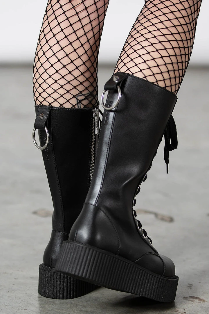 Who said basic had to be boring? Our ‘Fall Out’ Combat boots are perfect for stomping about town or for a night under the stars. Crafted in luxe vegan leather with a small platform sole, full length zip and laces with hardware details on the back of the boot. Perfectly practical.