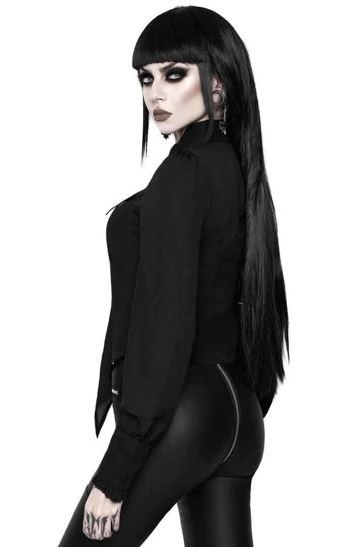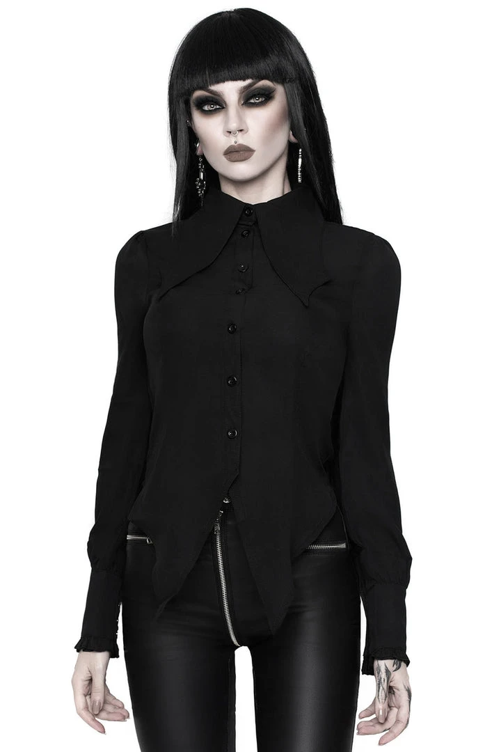 Strike fear and get ready to slay in our ‘Night Call’ bat-shirt. The perfect combination of darkness and decadence – conjured using a luxe sheer woven fabric which stretches to perfection for a deadly fit! Finished with an exaggerated bat-collar, button front and lavish wide cuffs. This statement-piece is an opulent addition to any dark vamps collection – looks killer dressed up or down!