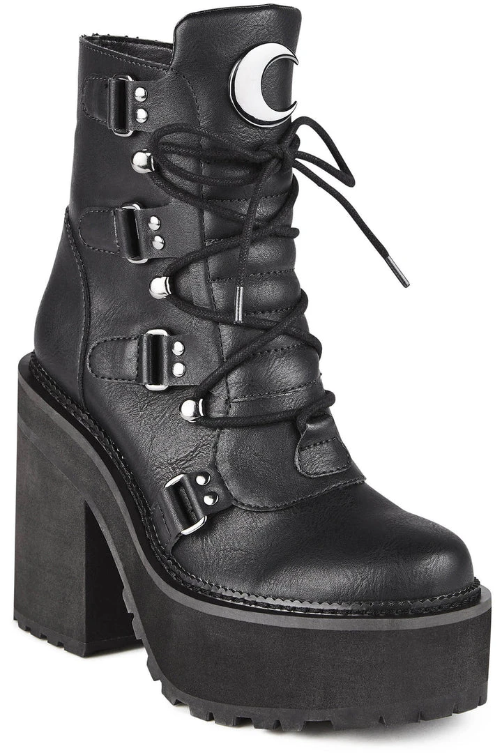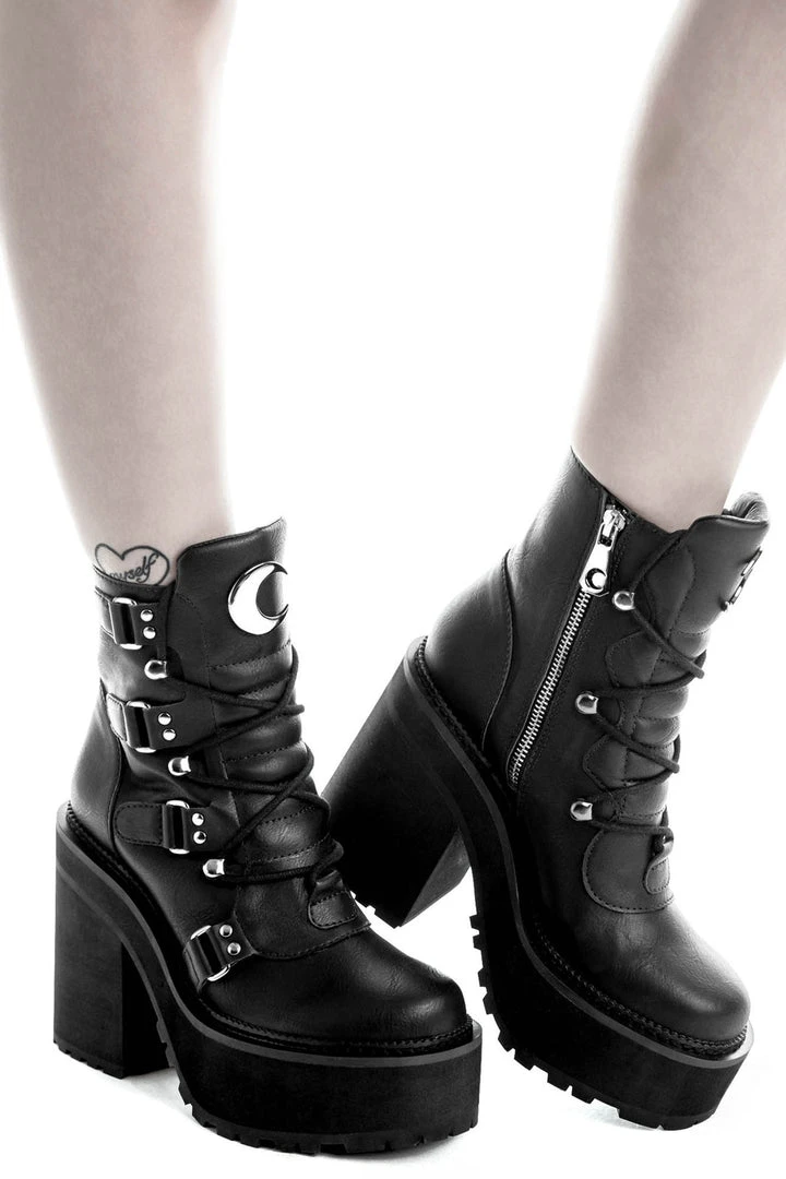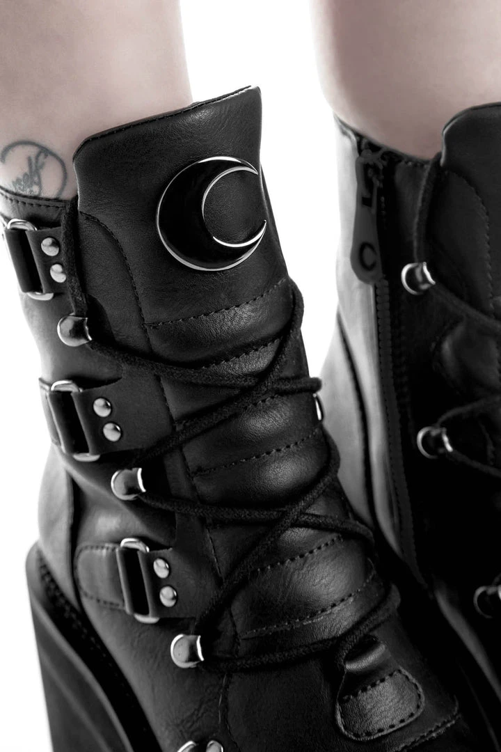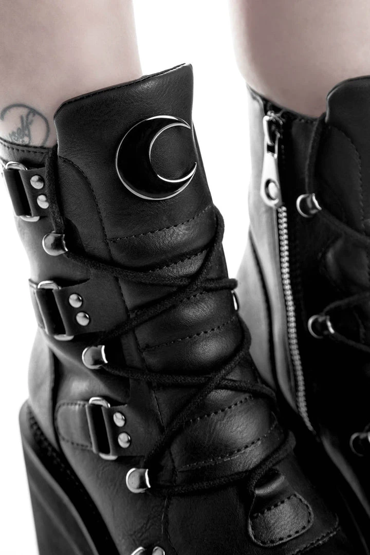 You’re a day dreamer and a night thinker; ‘Broom Rider’ boots come in a luxe faux leather, crescent moon hardware, lace feature and high platform – giving you just the right amount of elevation. Ready to rock with yer coven, nights out – or just doing day-to-day adventures.