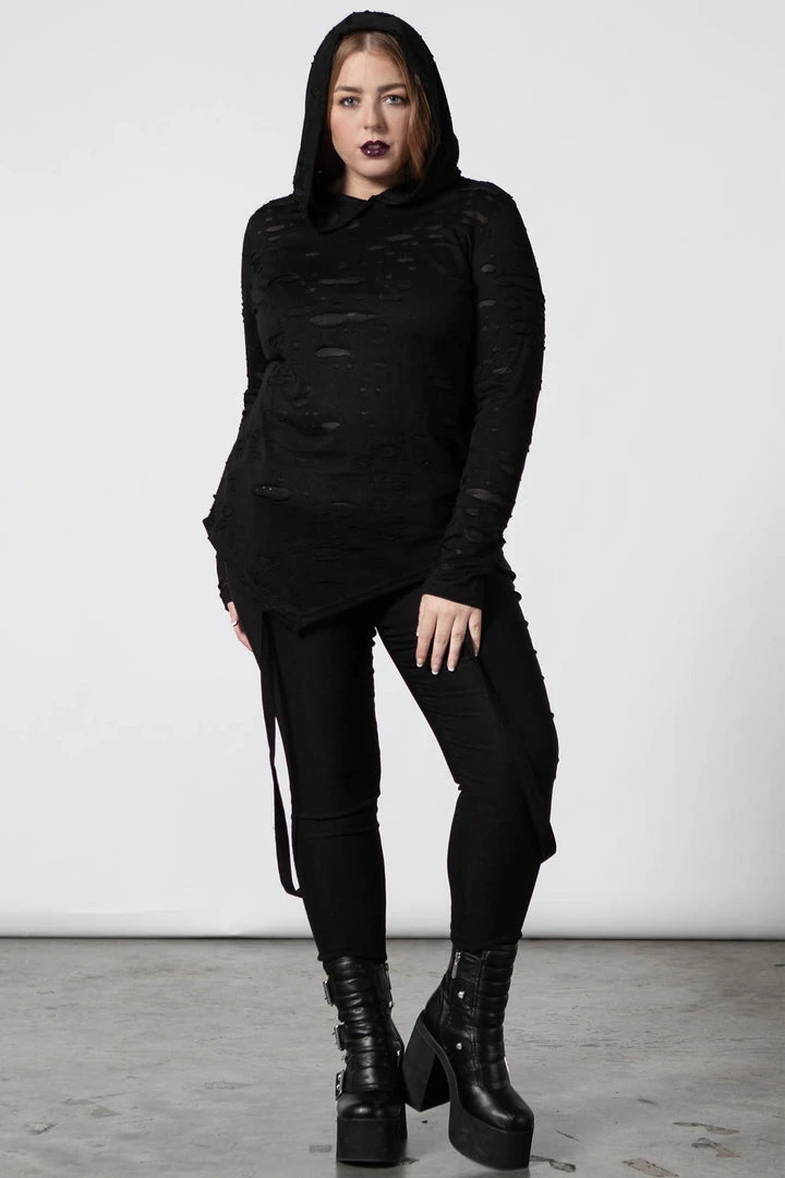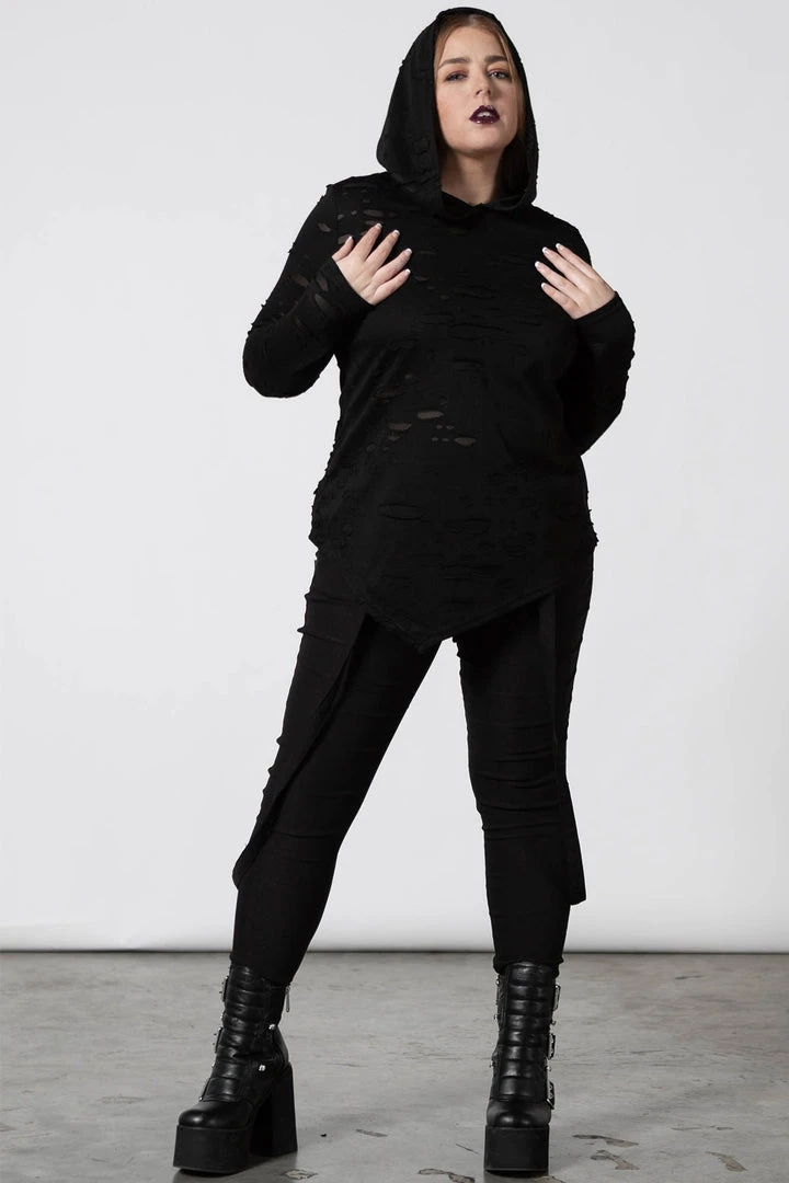 Ready to chill/thrill/kill any hour of the day with our ‘Infernia’ hooded top. Super-soft fabric with just the right amount of stretch, large hood, lace-up detail on the chest, long bell sleeves and buckle accents. An essential piece – easy to wear and goes with anything!