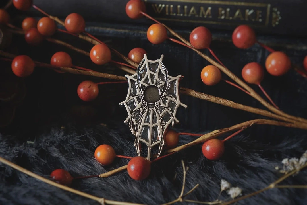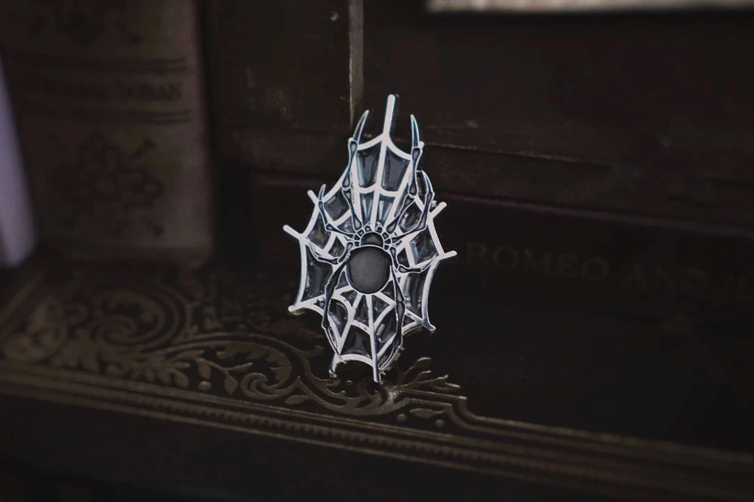 2” pin, featuring semi-transparent black enamel for the spider (glistens in the light) & intricate cutouts + transparent enamel for the spiderwebs ????✂️