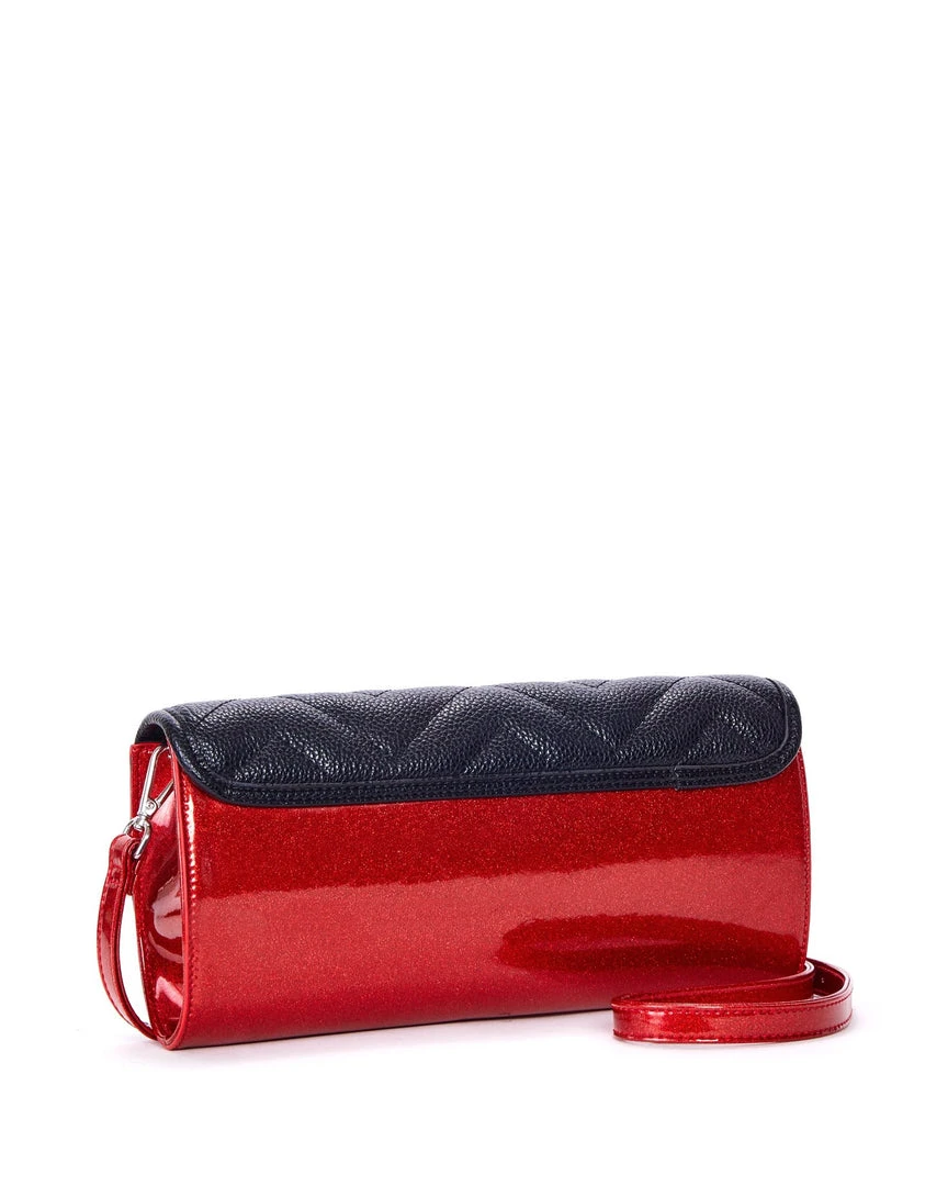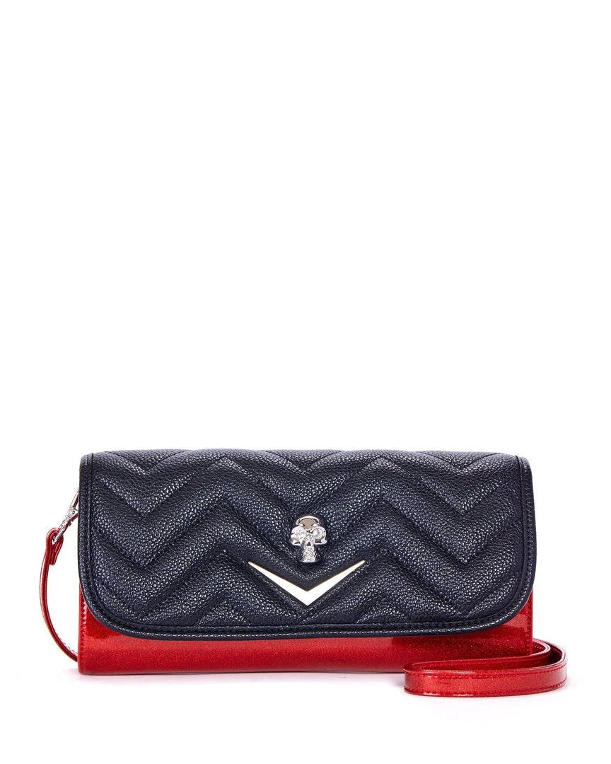 Our new Mini Hellraiser Totes are deliciously dark. They feature our all over chevron stitching and our skull and chevron hardware. Inside is lined with black on black leopard with a zipper closure pocket and silver bullet feet on the bottom. Also comes with a detachable and adjustable crossbody strap and also can be worn as a clutch. Just enough room for all your spooky essentials.