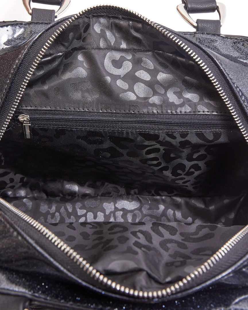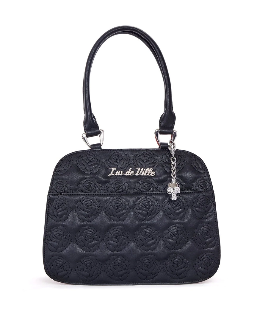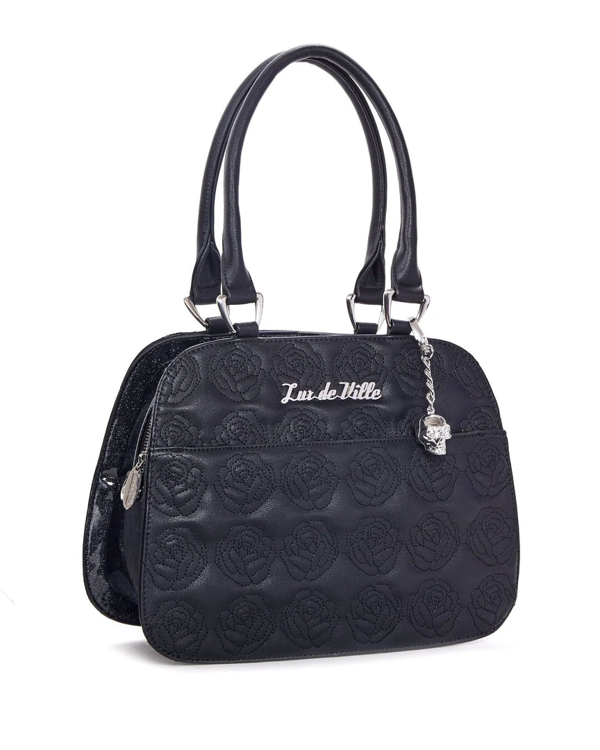 These beautiful totes feature our all over rose stitching and detachable skull bauble with rhinestone eyes. Perfect size for day and night with a front button closure pocket for easy stashing. Inside is lined with black on black leopard and inside zipper closure pocket. Also comes with a detachable and adjustable crossbody strap. Enjoy.