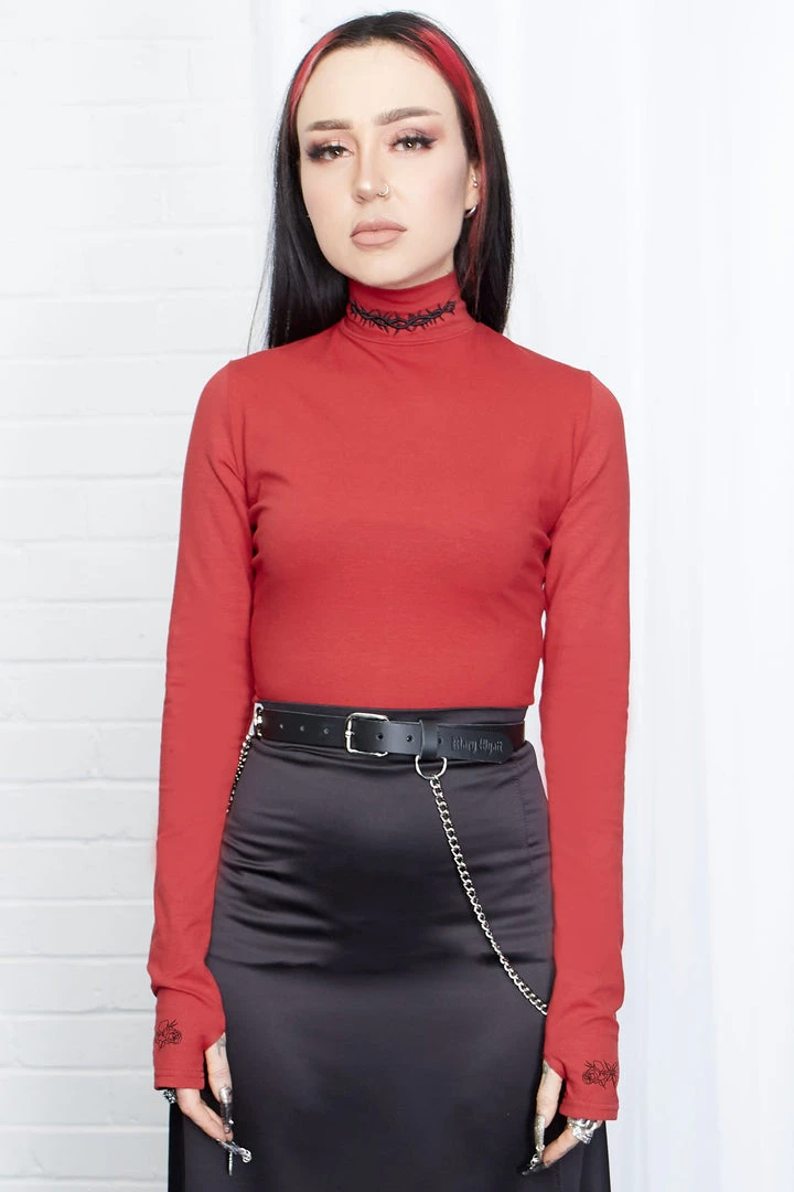 Featuring a high mock-neck with a hidden zip fastening to the back; this top is made from a premium medium-weight cotton jersey in the deepest shade of blood red. Complete with contrasting black embroidery to the front neckline – the pain and pleasure is in those thorny details.