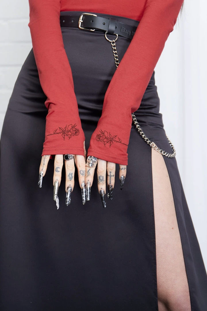 Finished with extra long sleeves and secret thumbholes; wear them over your hands to reveal a delicate hidden black rose across the knuckles.