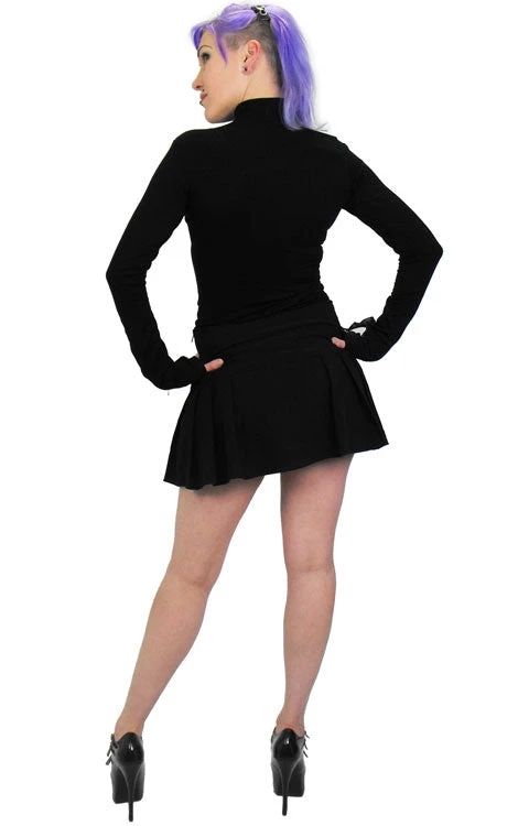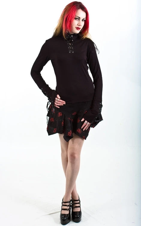 Soft black jersey top with black satin ribbon lace up features on the cuffs and collar. This blouse is comfortable like a leotard but updated for grown up wear.