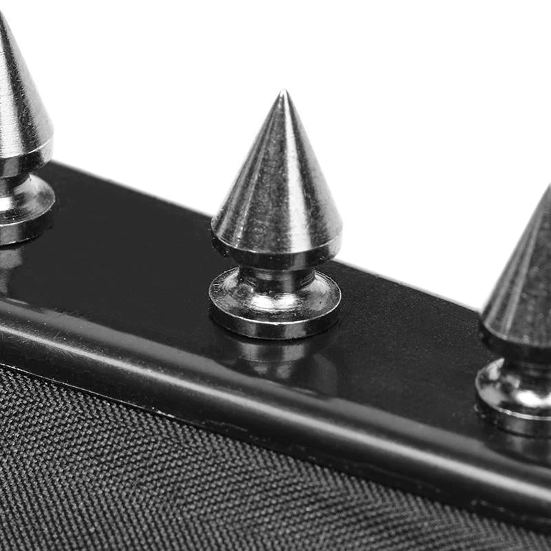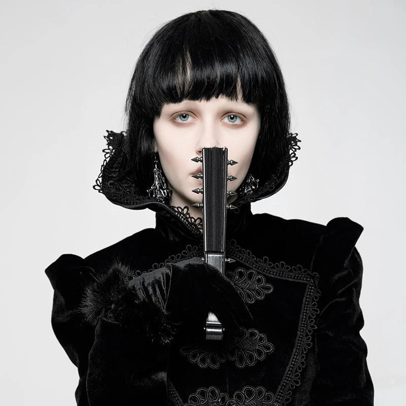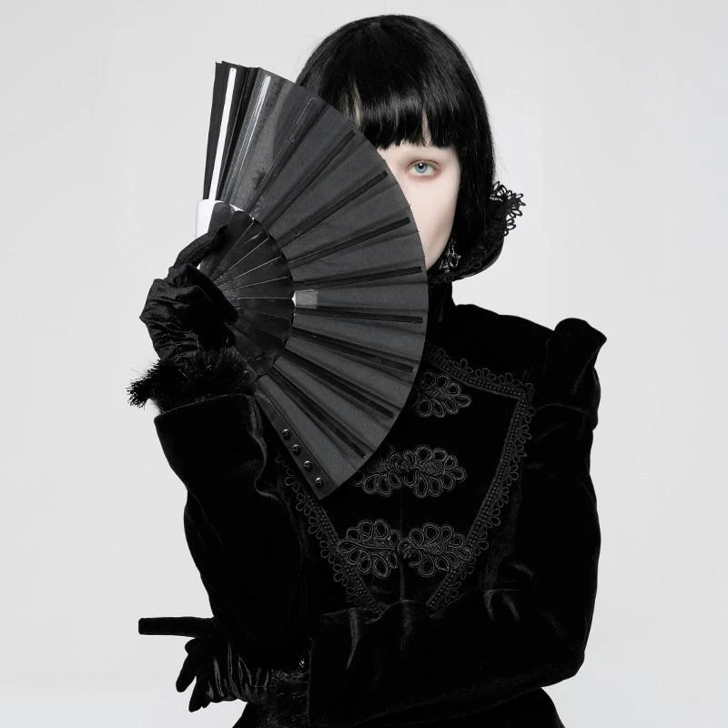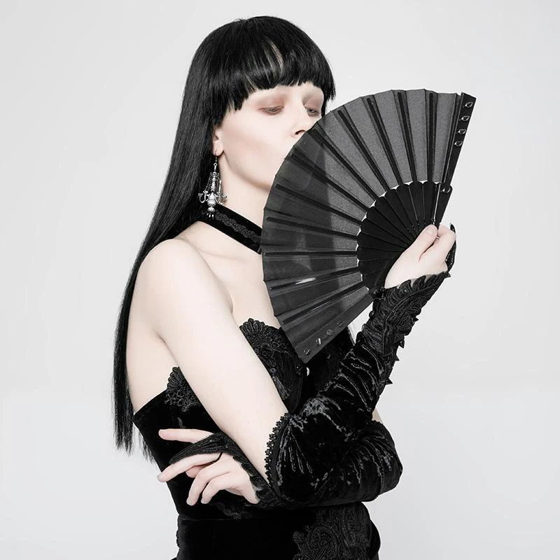 Ladies Punk Gothic Fabric Rivet Fan is made with lightweight black cloth. The fan frame is black plastic material. High-grade metal cone rivets decorate both sides.