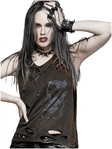 Catacomb – women’s open side tank top by Punk Rave. Post-Apocalyptic Industrial Grunge style irregular slashed tie-dye sleeveless dark green cotton side-cut t-shirt.