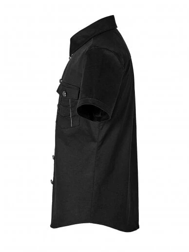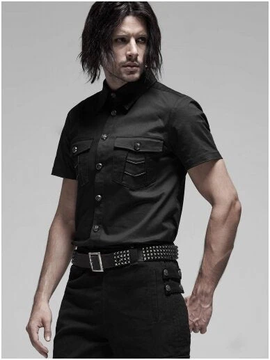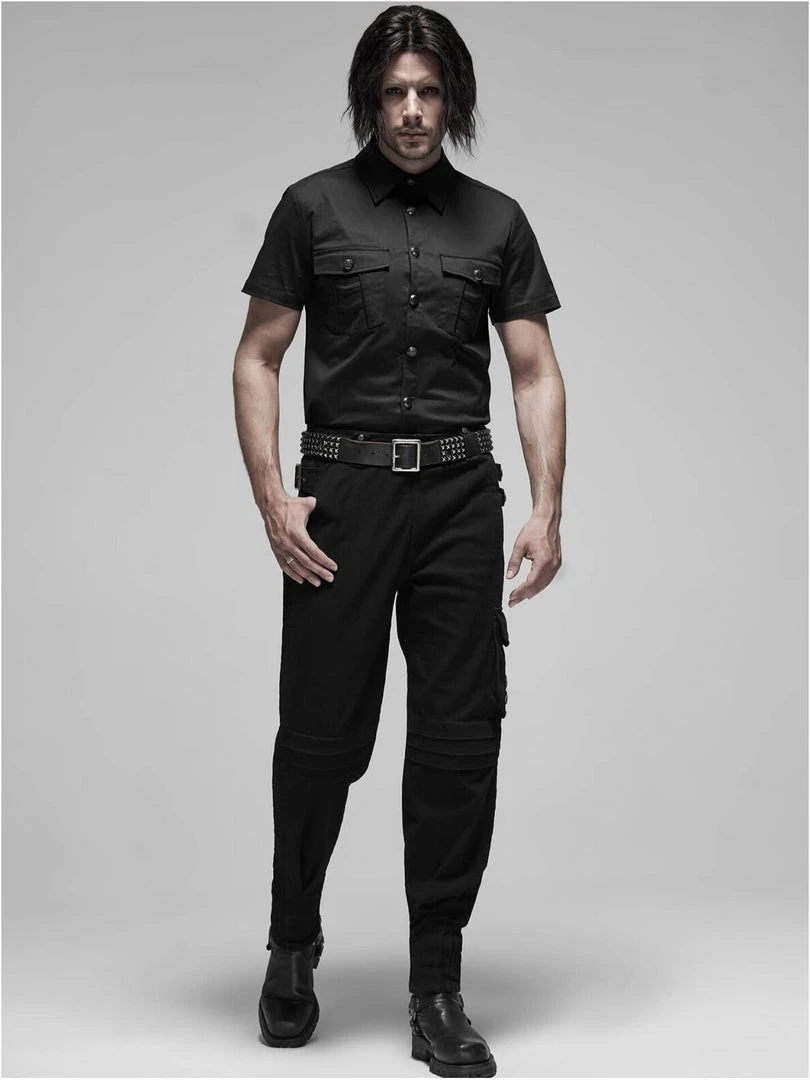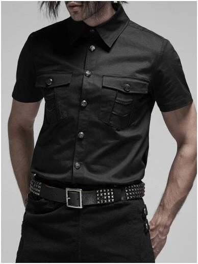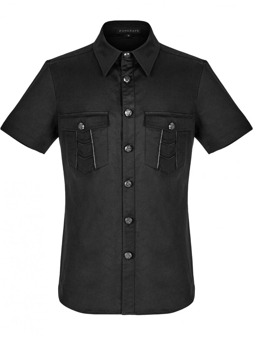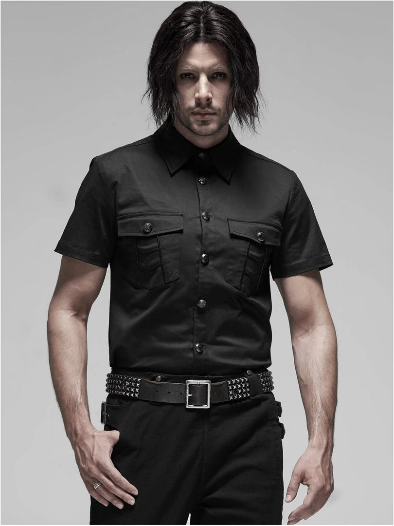 Detroit Shirt by Punk Rave. Gothic Military style men’s black short sleeve shirt with accents on the pockets. Black press-stud buttoned front closure.