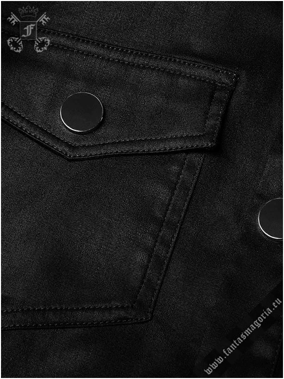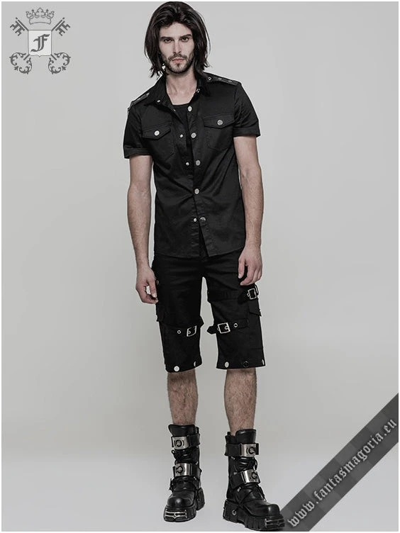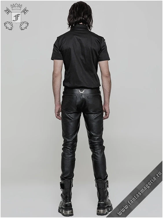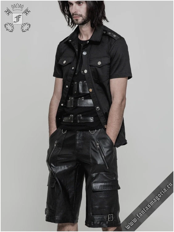 Gothic casual wear men’s black short-sleeved shirt with synthetic vegan leather epaulets.