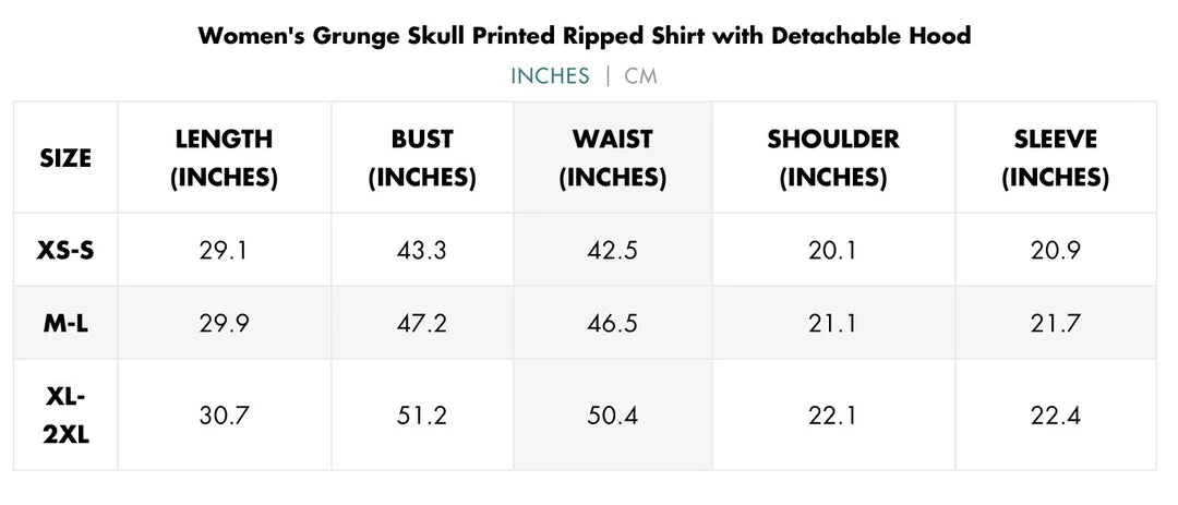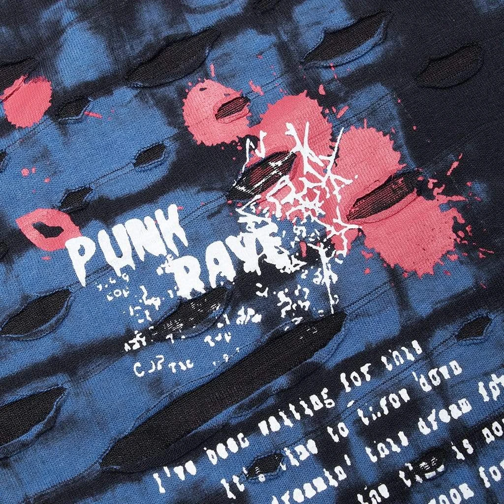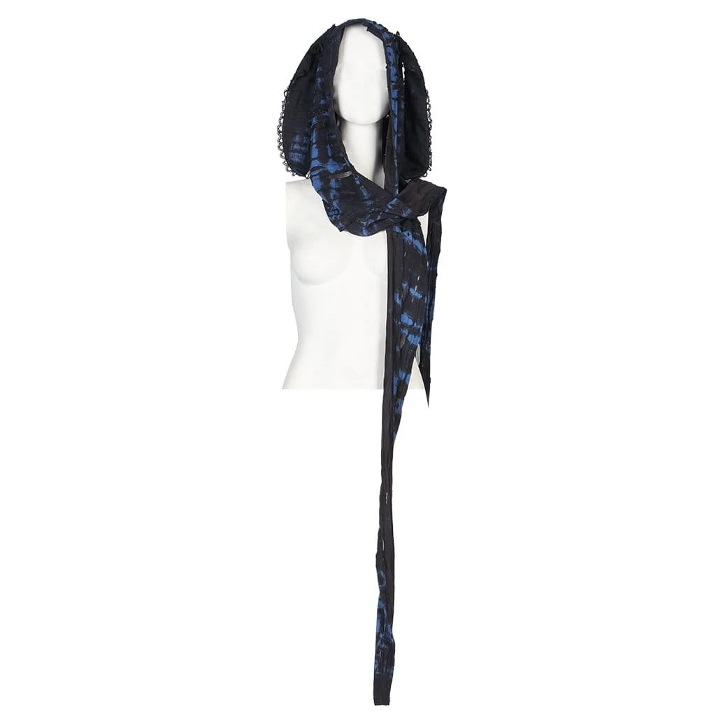 Black and blue, layered ripped shirt with detachable hood, screen-printed skull, and detachable strap.