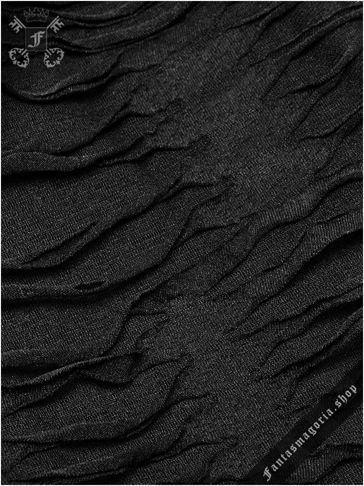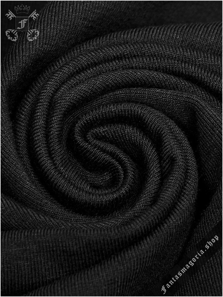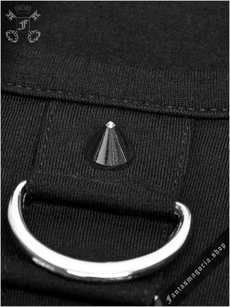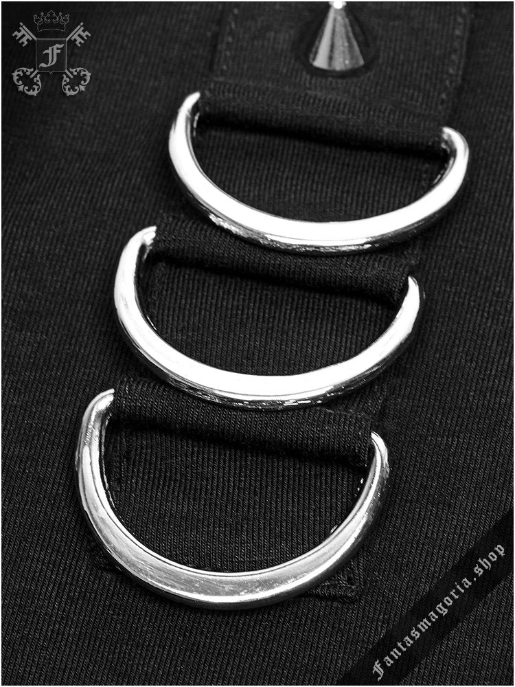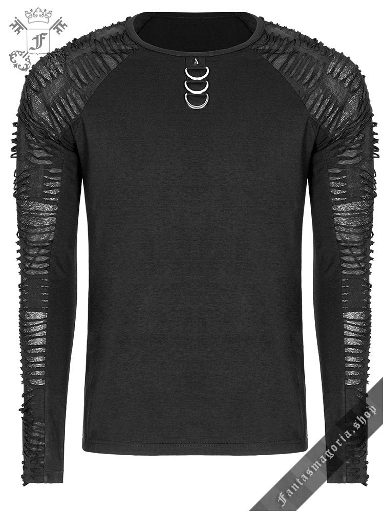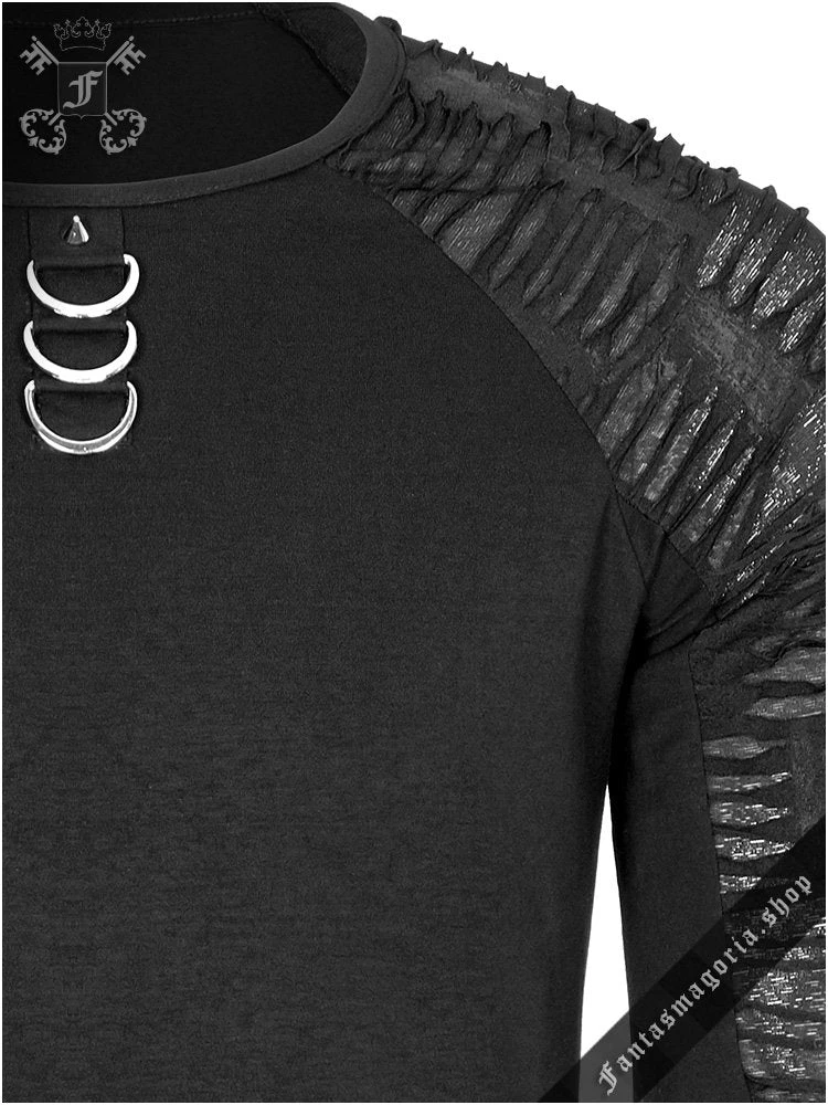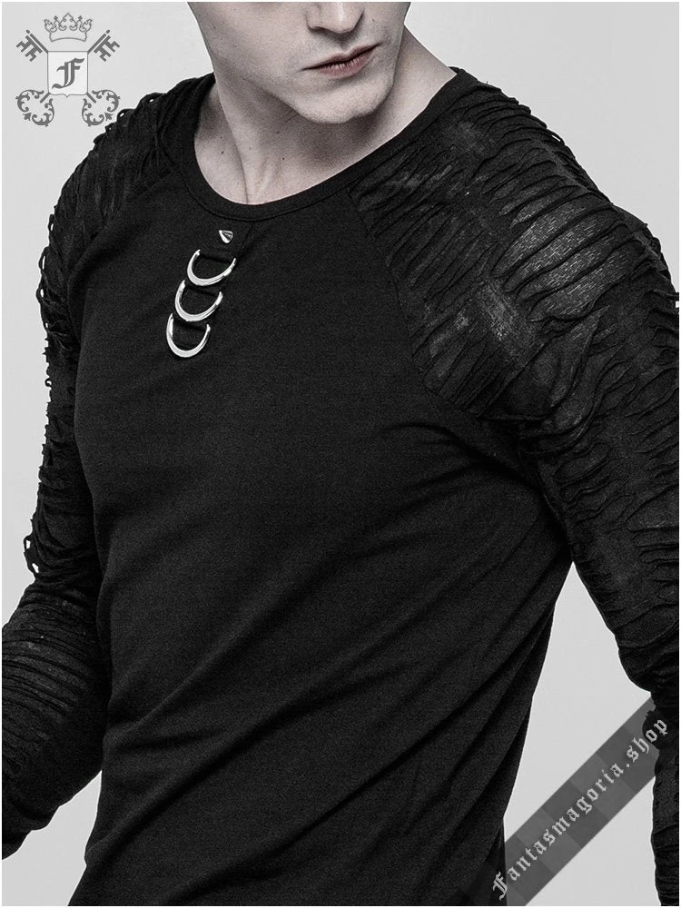 Gothic Industrial men’s black long-sleeved T-shirt with distressed sleeves and D-rings neckline decoration.