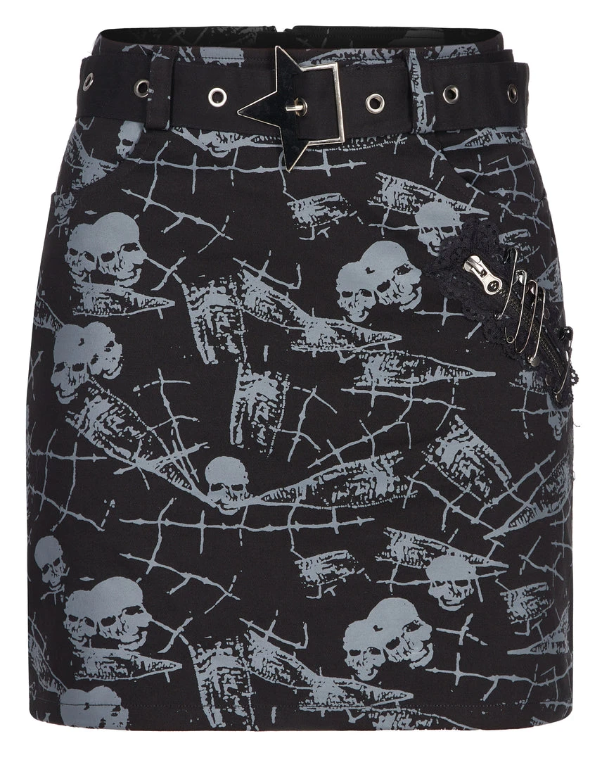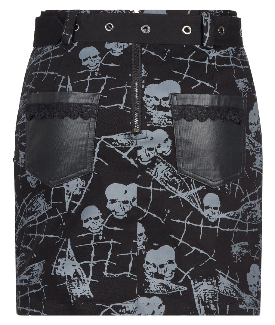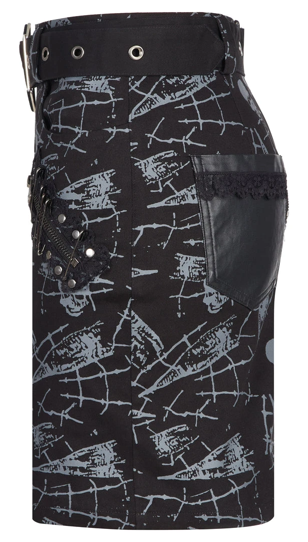 Black mini skirt from Punk Rave with skull and spiderweb print. Fitted, stretch fabric featuring a removable belt, a distinctive and pocket hardware accents.