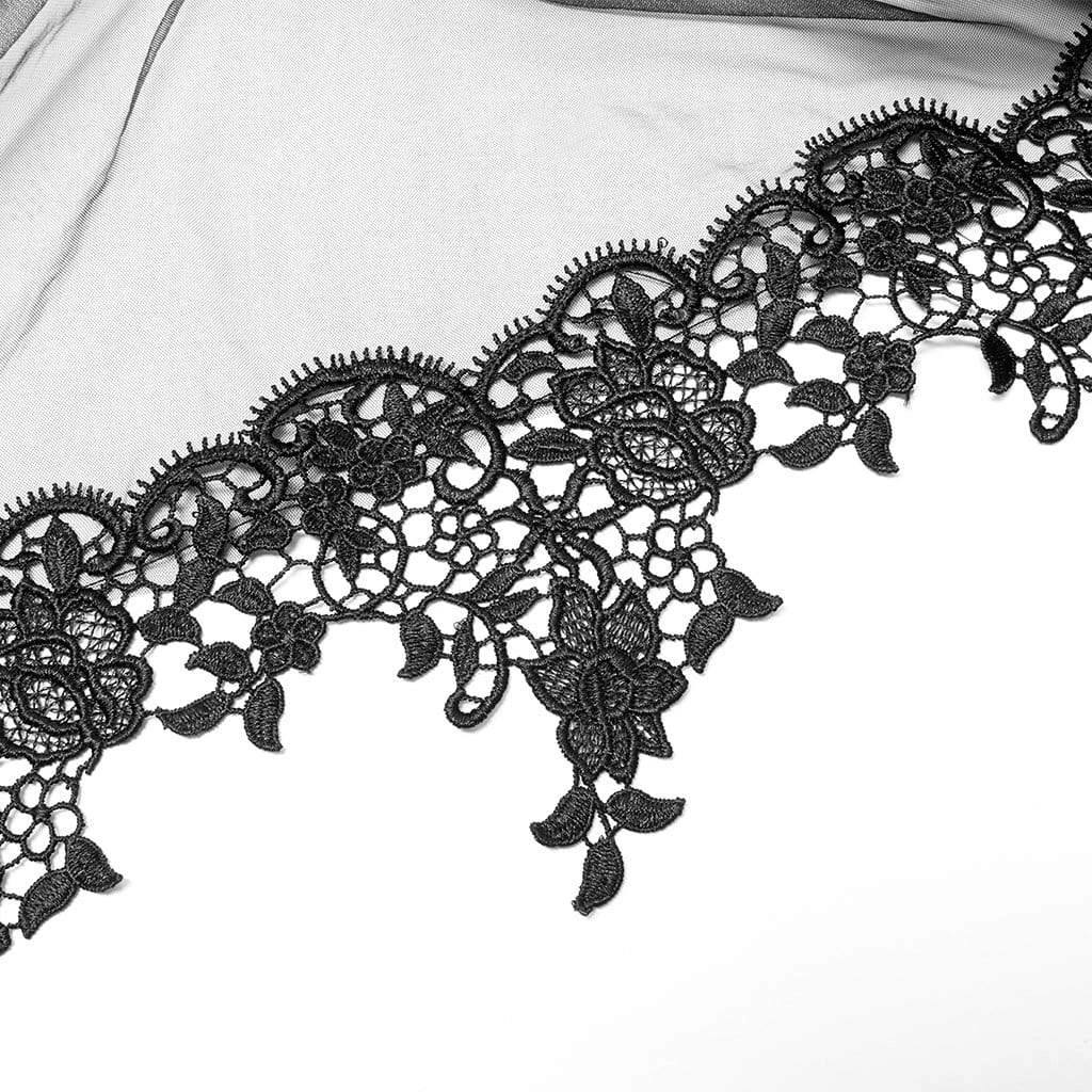 Beautiful, long black dress with flocked damask pattern, layered and draped skirt covered in a black mesh with lace trim. Can be worn with or without the straps.