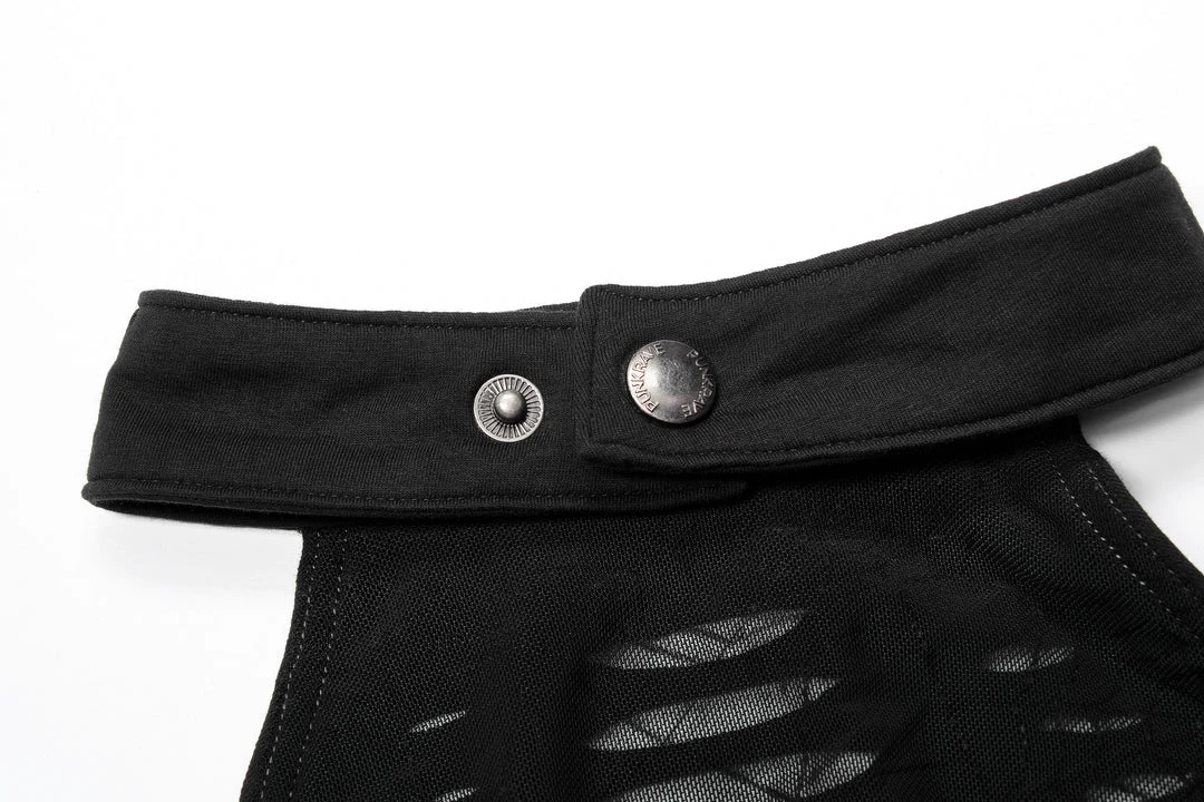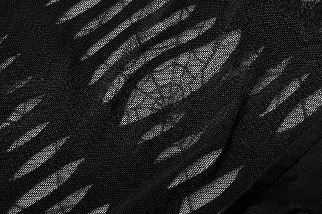 Amazing stylish stretchy fitted black top from Punk Rave. This gorgeous top features spider web mesh with a spliced black fabric overlay. This top is attention catching and beautiful and also feature an adjustable neck collar for the perfect fit and hollowed out back for extra impact.