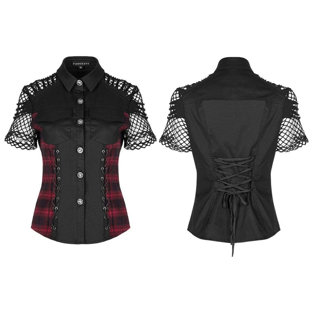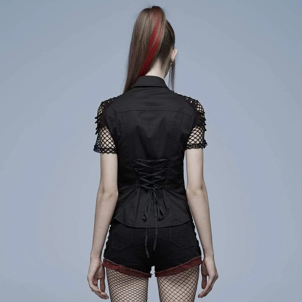 Black and red top with shredded mesh short sleeves, lacing up the front and back, and skull buttons. Fitted, stretch material.