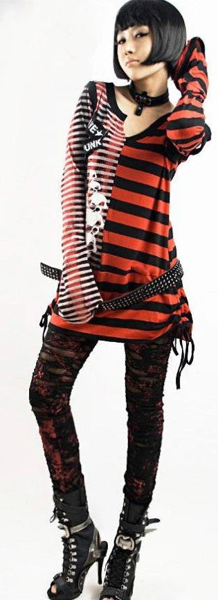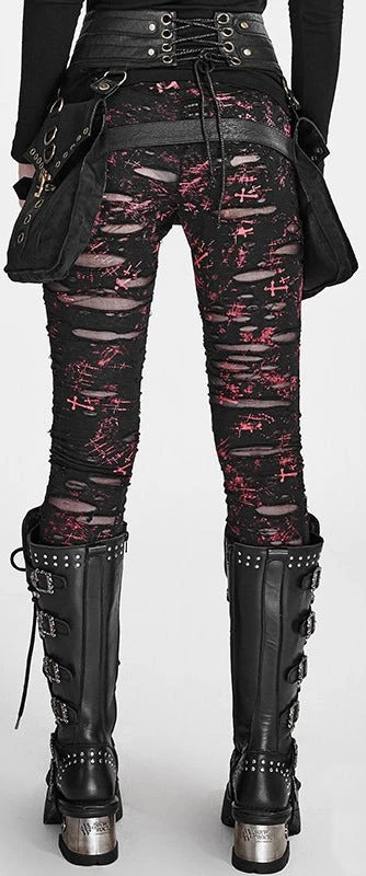 Ripped off leggings by Punk Rave. Grunge Post Apocalyptic and Gothic Punk style torn frayed black and red leggings.