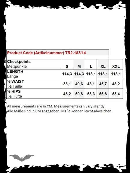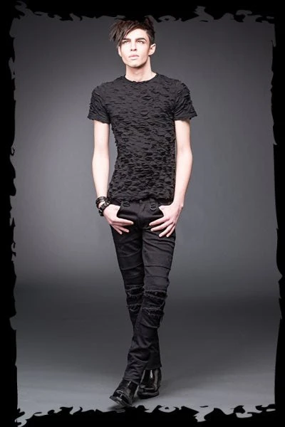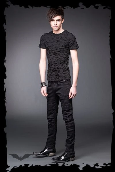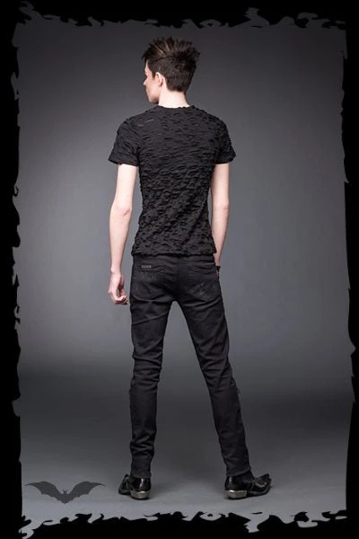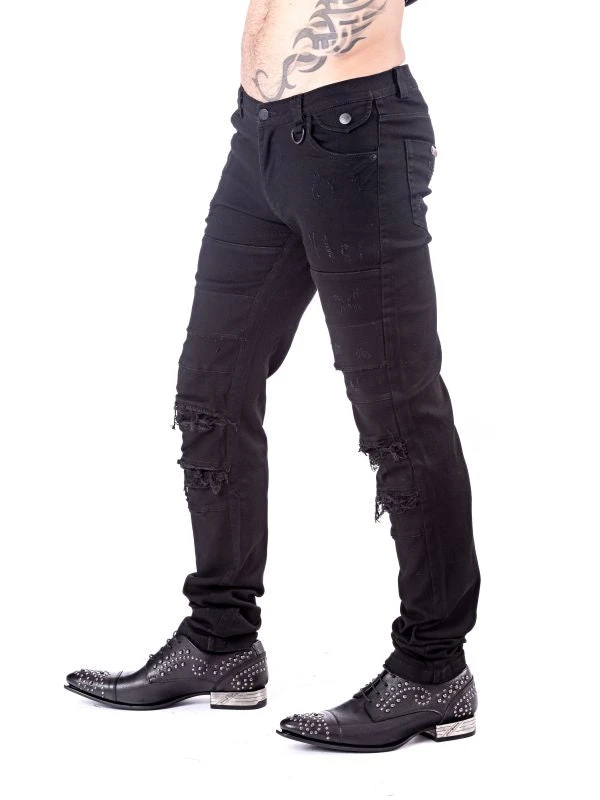 Black Pants with Slits by Queen of Darkness. Slightly stretchy material with 5 pockets, 2 d-rings on the front, 1 d-ring on the back, and shredded throughout and the Queen of Darkness bat on the buttons.
