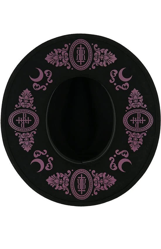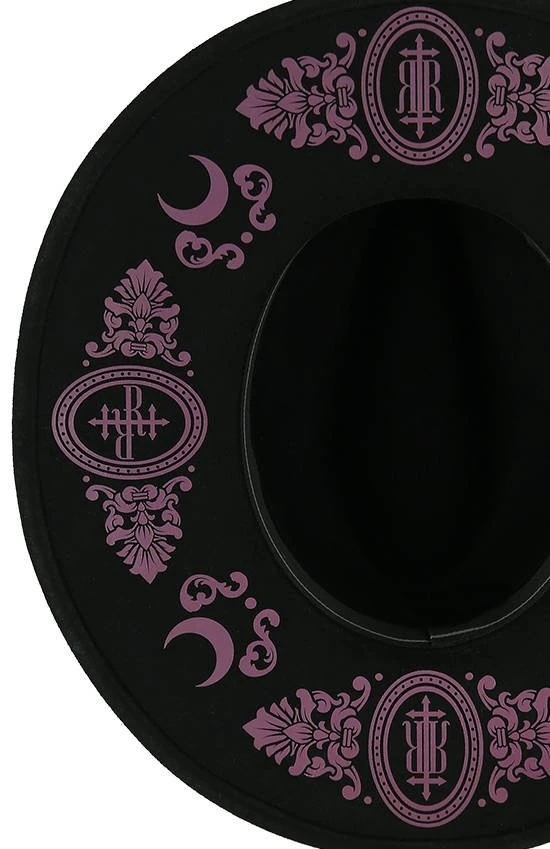 The gothic hat is completely stiffened so that the brim keeps its shape. On the inside, it’s covered with a decorative print with the Restyle monogram in a baroque frame. The entire hat is black, while the print is red wine (burgundy).