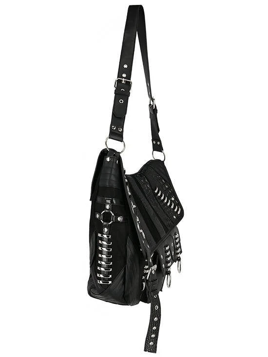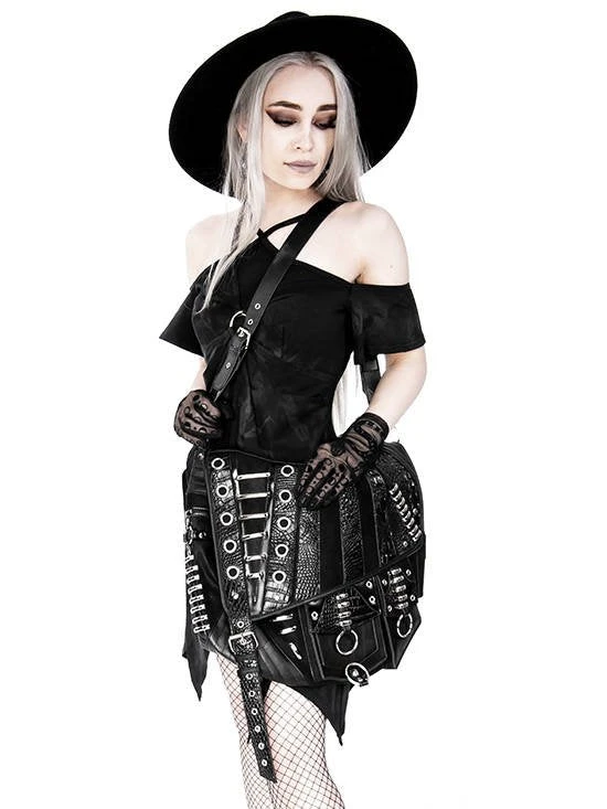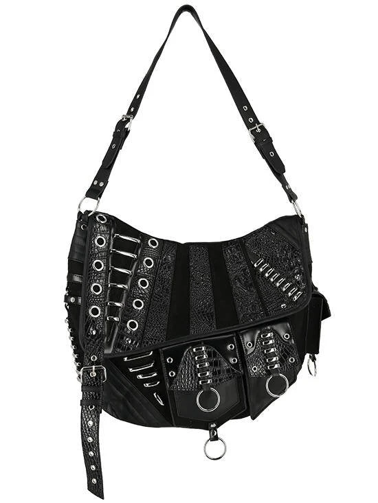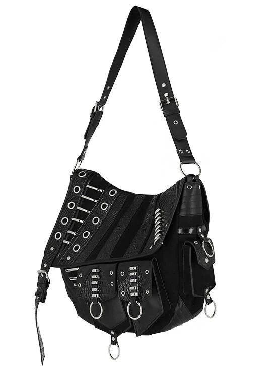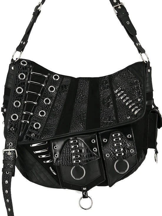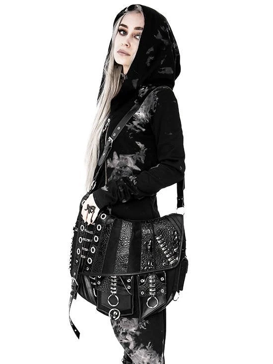 Gothic handbag made of black, solid suede. Stitching and decorations are made of two types of artificial leather – smooth and dragon. Dragon leather has an interesting structure resembling snake or dragon scales. The hobo shape will fit, for example, things for work, for the afternoon gym, and shopping on the way back home. The additional number of pockets and compartments will keep your things organized. Your keys will never get lost in it.