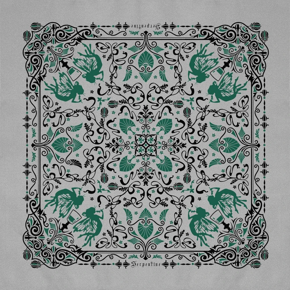 Absinthe Bandana is Black and vintage Sea Foam Green on a Grey Bandana and Features Absinthe fairies Celebrating the boundaries of a strange intoxicating reality. Designed diagonally so once it’s folded and tied it will display at it’s very best. 100% Cotton fabric blend makes it easy to wrap and tie on the go! One size fits all and measures approximately 21.5″ x 21.5″.