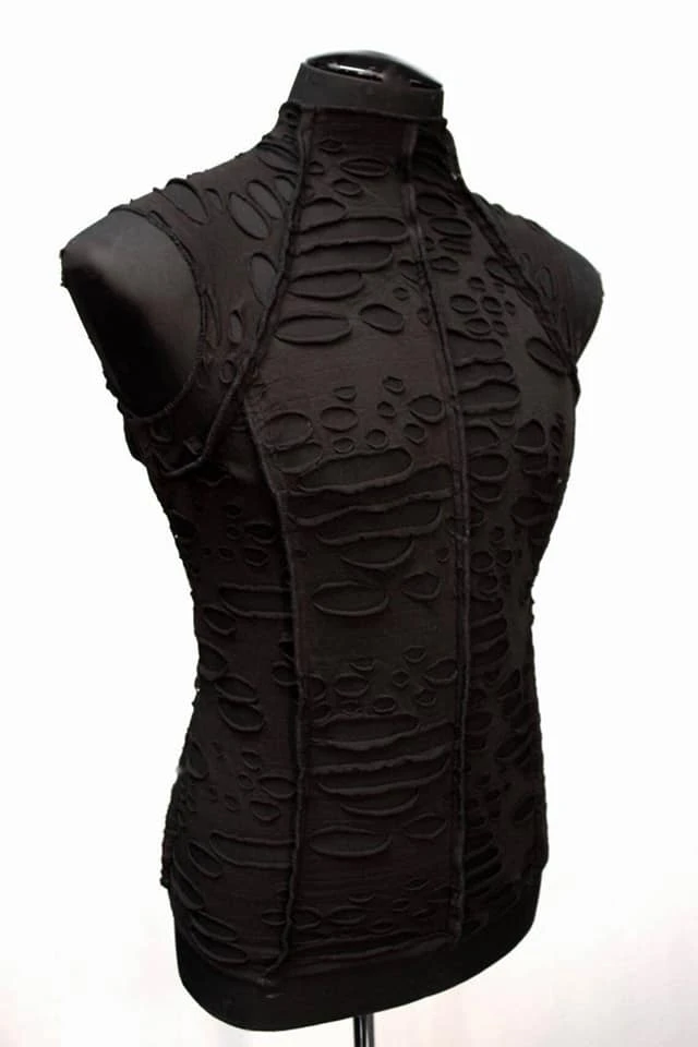 Future Shock! A tight fitting Science Fiction style T-shirt from the not so distant future. This t-shirt is made of comfortable double layer black stretch fabric. The top layer has been sprinkled with acid rain for a “decayed” appearance. The bottom layer is sheer stretch fabric. The exposed overlocked seams give the t-shirt a deconstructed futuristic appearance and accentuate the figure. Zips at the neck in back to make it easier to get over your head. Comes in sizes Small-XXL. Very cool.