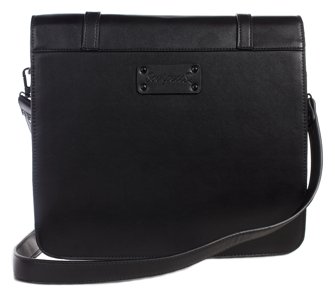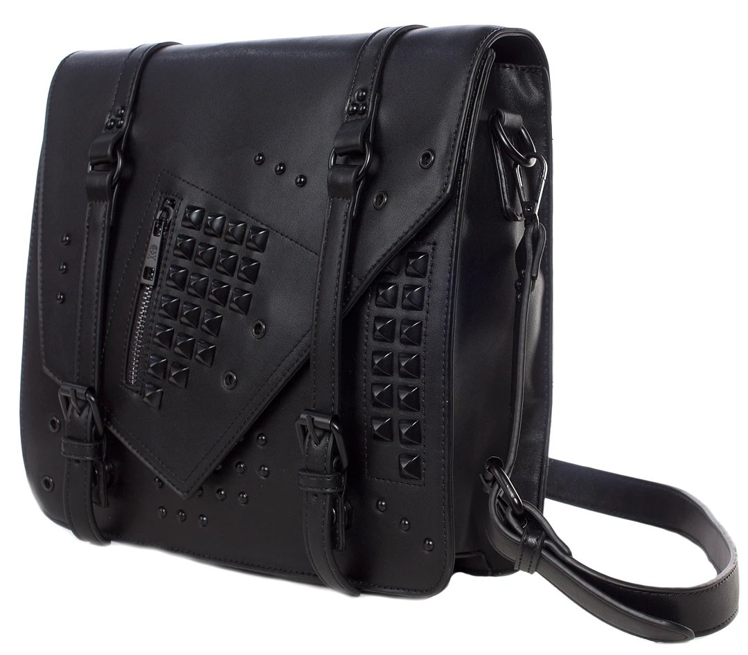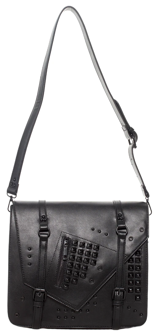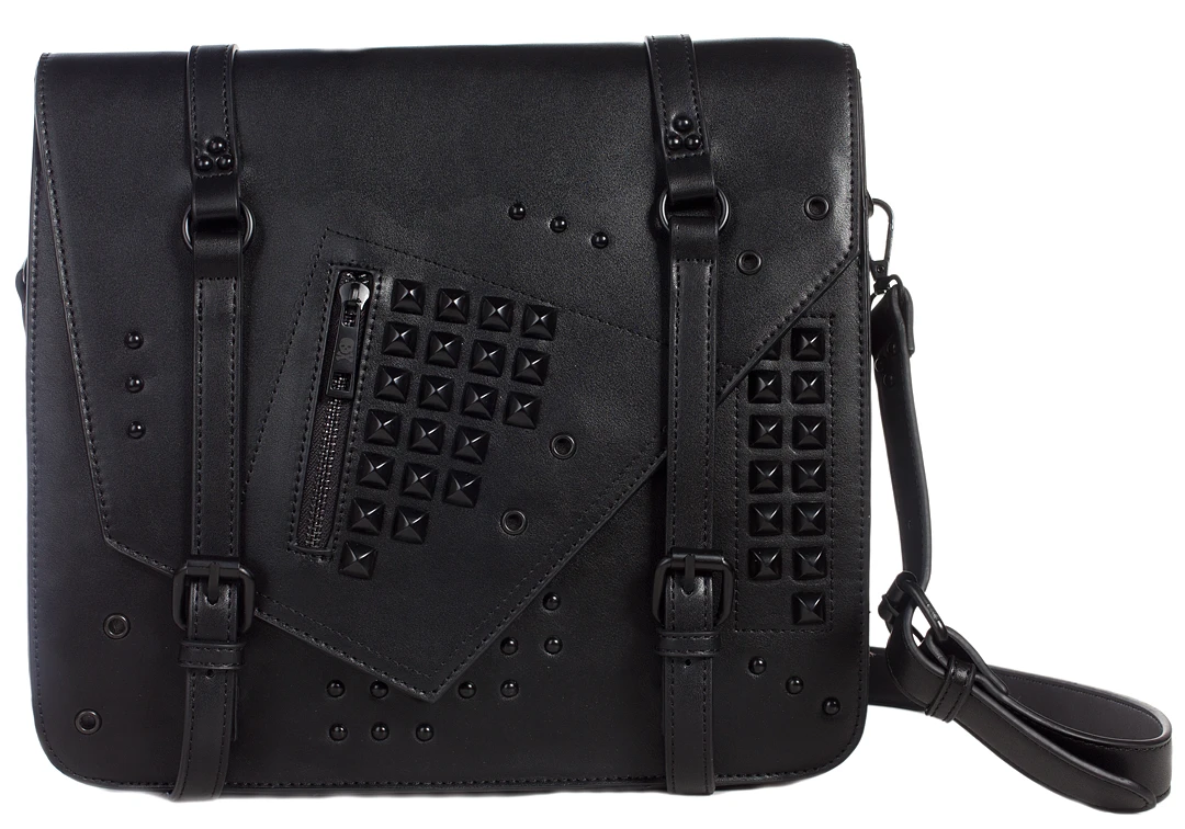 The Sourpuss Idoless Saddle Bag effortlessly combines the sleek styling and edgy look you’ve been waiting for! This sturdy, faux-leather purse truly has it all, including a removable/adjustable strap, interior zip pocket, satin interior lining and generous space for your essentials. This stunning bag is completed with black stud and grommet detailing on the front, with two decorative-buckle straps that snap easily into place to keep it closed. It’s an all-black package that’s absolute excellence!