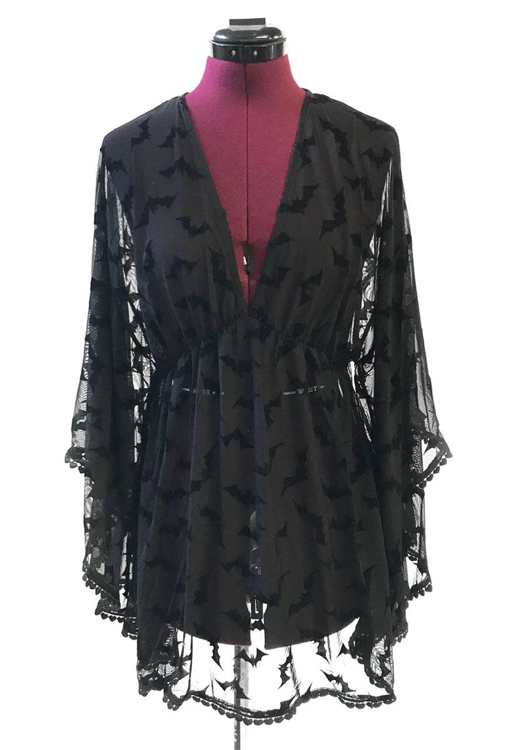 Luna Bats Cover Up is a mesh coverup with flocked black bats and pretty scalloped trim at the sleeves and hem. We love this over swimwear, but it’s also great over a little slip, too! There is elastic at the empire waist for added comfort and the sleeves have so much draaama! Bonus fact! We design our own fabric, so you won’t find this material anywhere else.