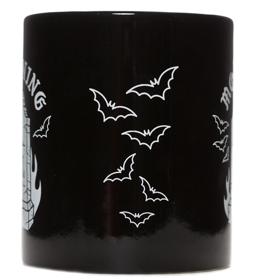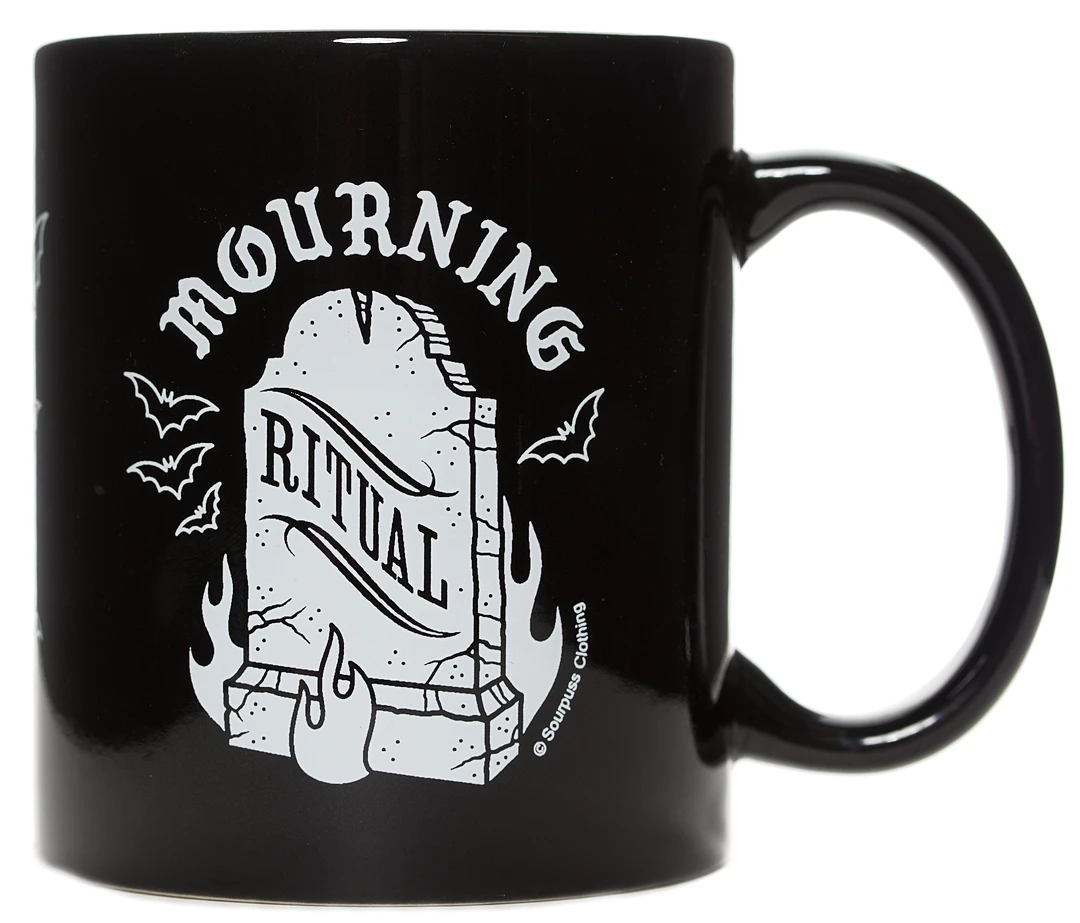 Start a new mourning ritual when you sip your favorite hot cup of coffee or tea from this Sourpuss mug! This ceramic black mug features original graphics in white of a tombstone and bats a plenty and is microwave and dishwasher safe.