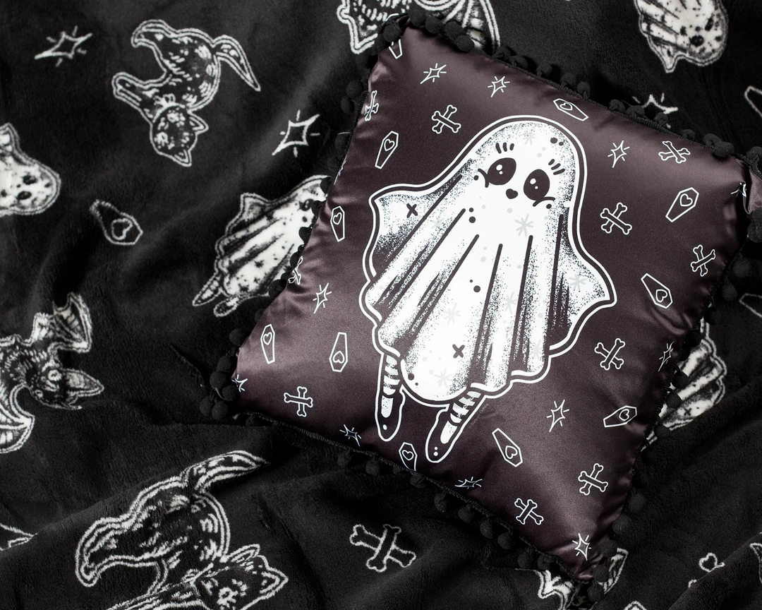 Booo! This blanket is all treats, no tricks – and so cute, it’s downright spooky! This unbelievably soft fleece blanket is the perfect size for snugglin’, featuring adorable lil’ ghosts, black kitties and bats, all dreamed by up Creep Heart. We think this fuzzy wonder will add the perfect spooky accent to your home year-round, so grab yours and get all wrapped up!