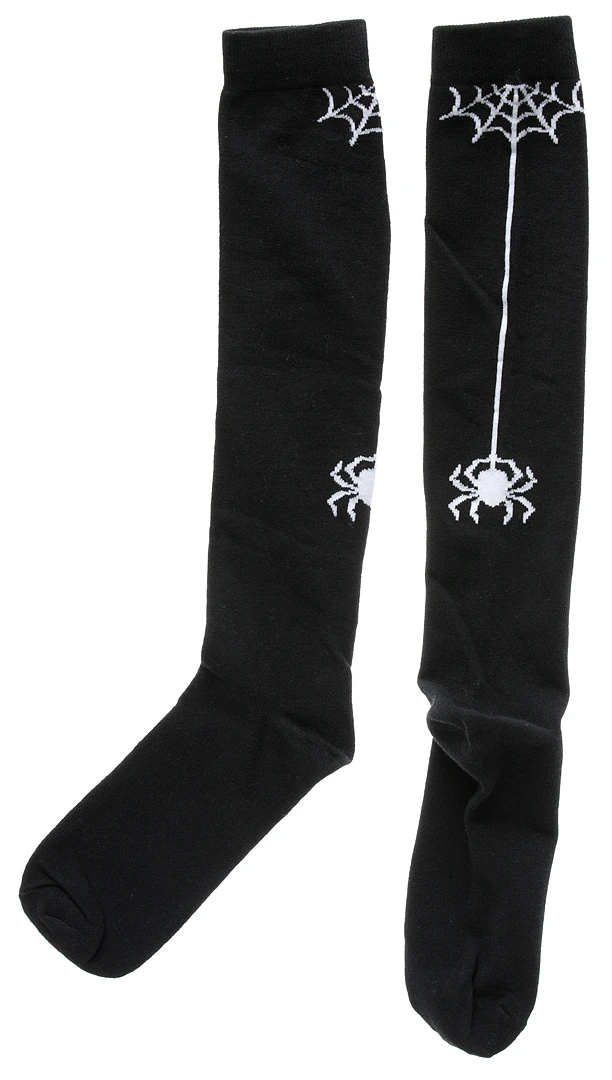 We’re all wound up in this web! These black knee socks feature a spiderweb at the back knee, with a descending arachnid. Pair ’em with just about anything to add a morbid touch to your ensemble.