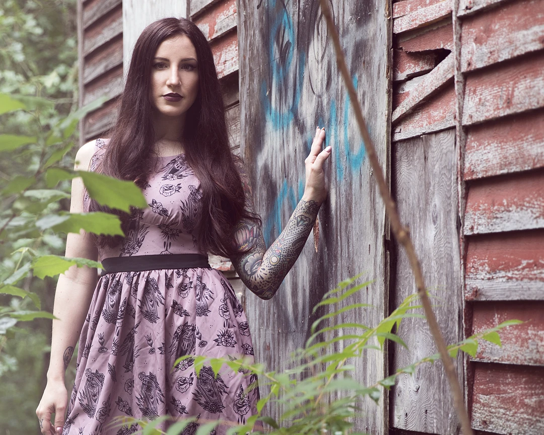 We love the dreamy mauve hue of the Sourpuss Die in Grace Shift Dress. It’s the perfect background for the macabre artwork of Ana Pantera – coffins, hearts, and roses! This dress has a flattering vintage silhouette, wide waistband, and hidden pockets!